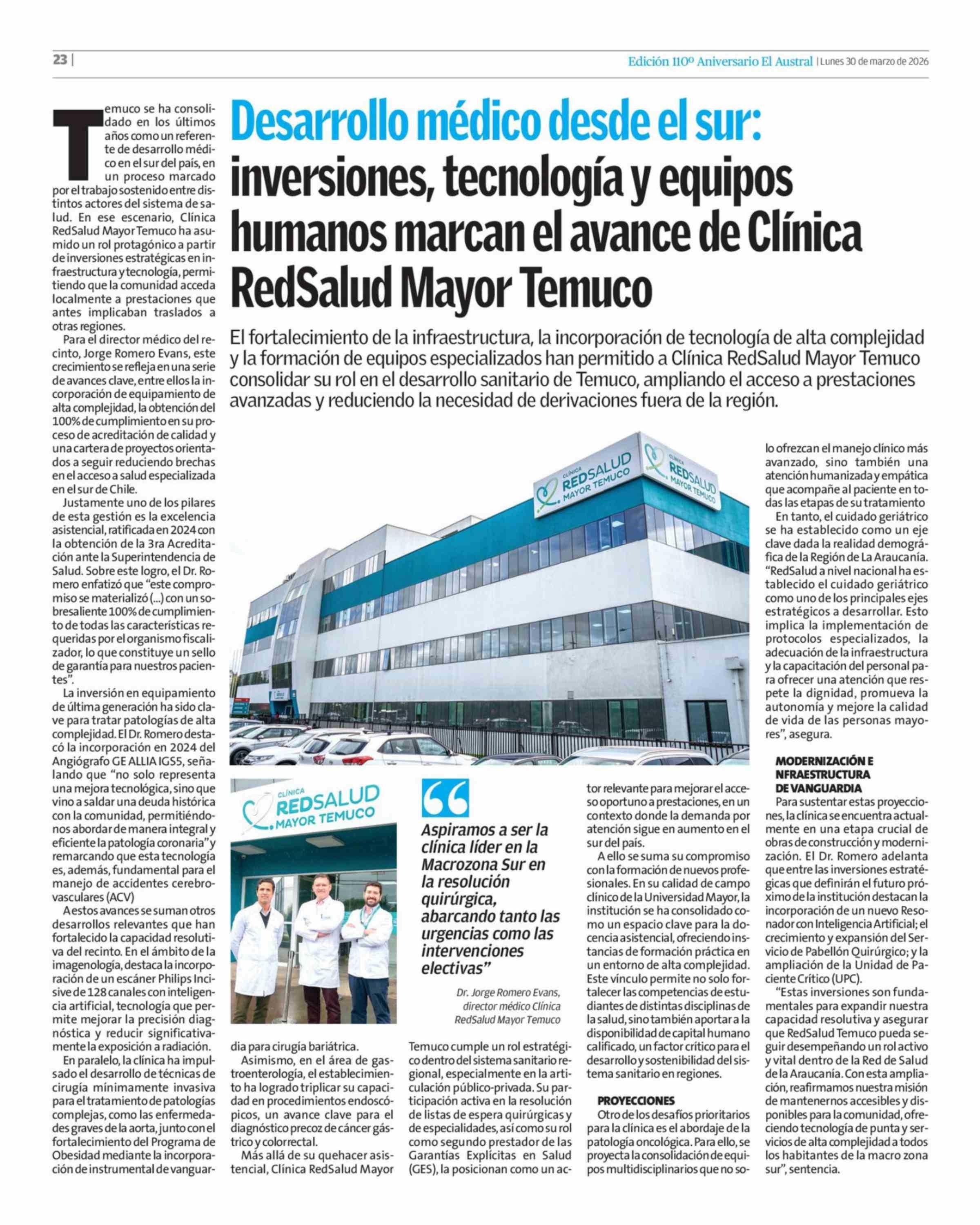 Desarrollo médico desde el sur: inversiones, tecnología y equipos humanos marcan el avance de Clínica RedSalud Mayor Temuco 30-03-2026 El Austral de la Araucanía |