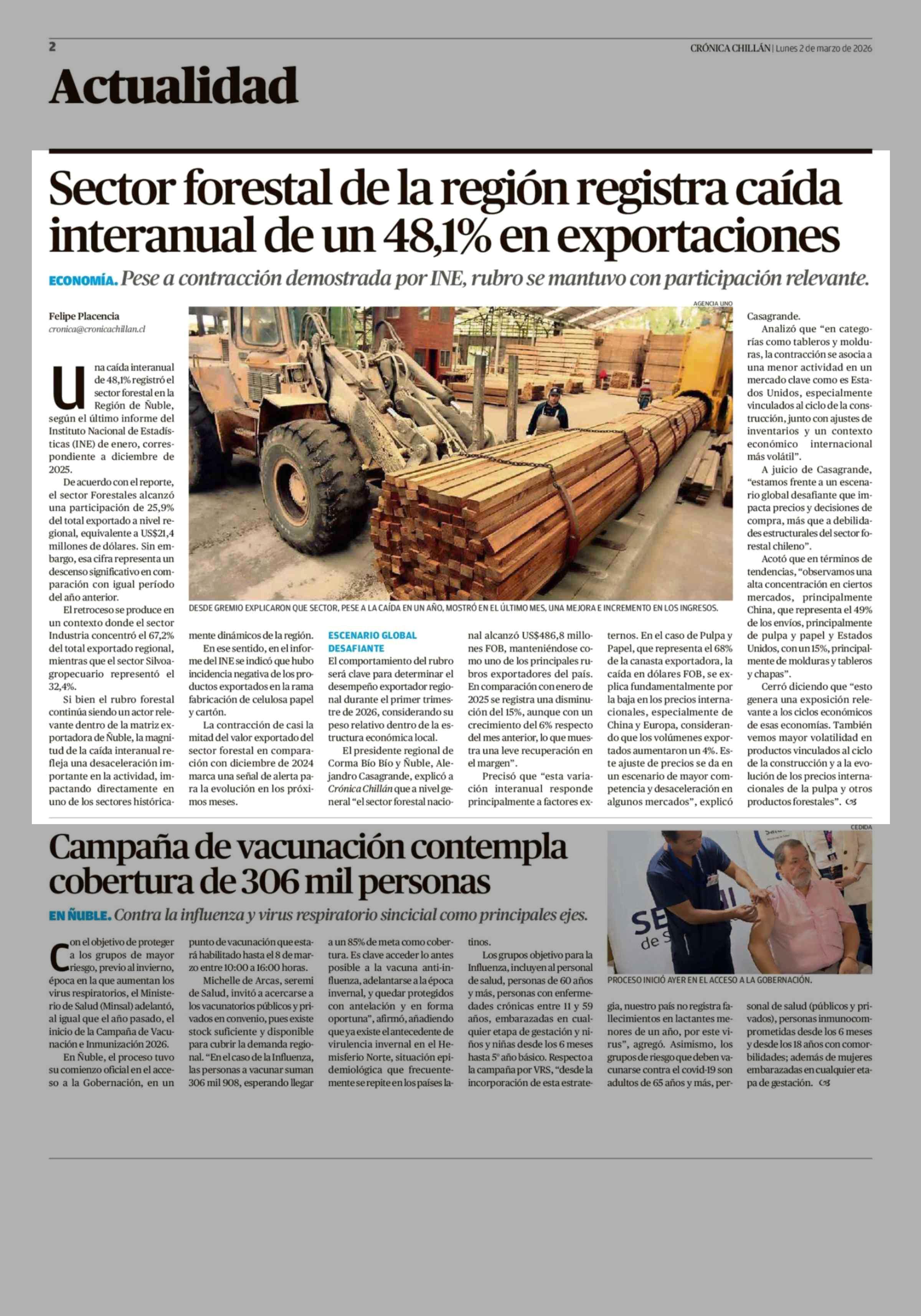 Sector forestal de la región registra caída interanual de un 48,1% en exportaciones 02-03-2026 Crónica de Chillán |