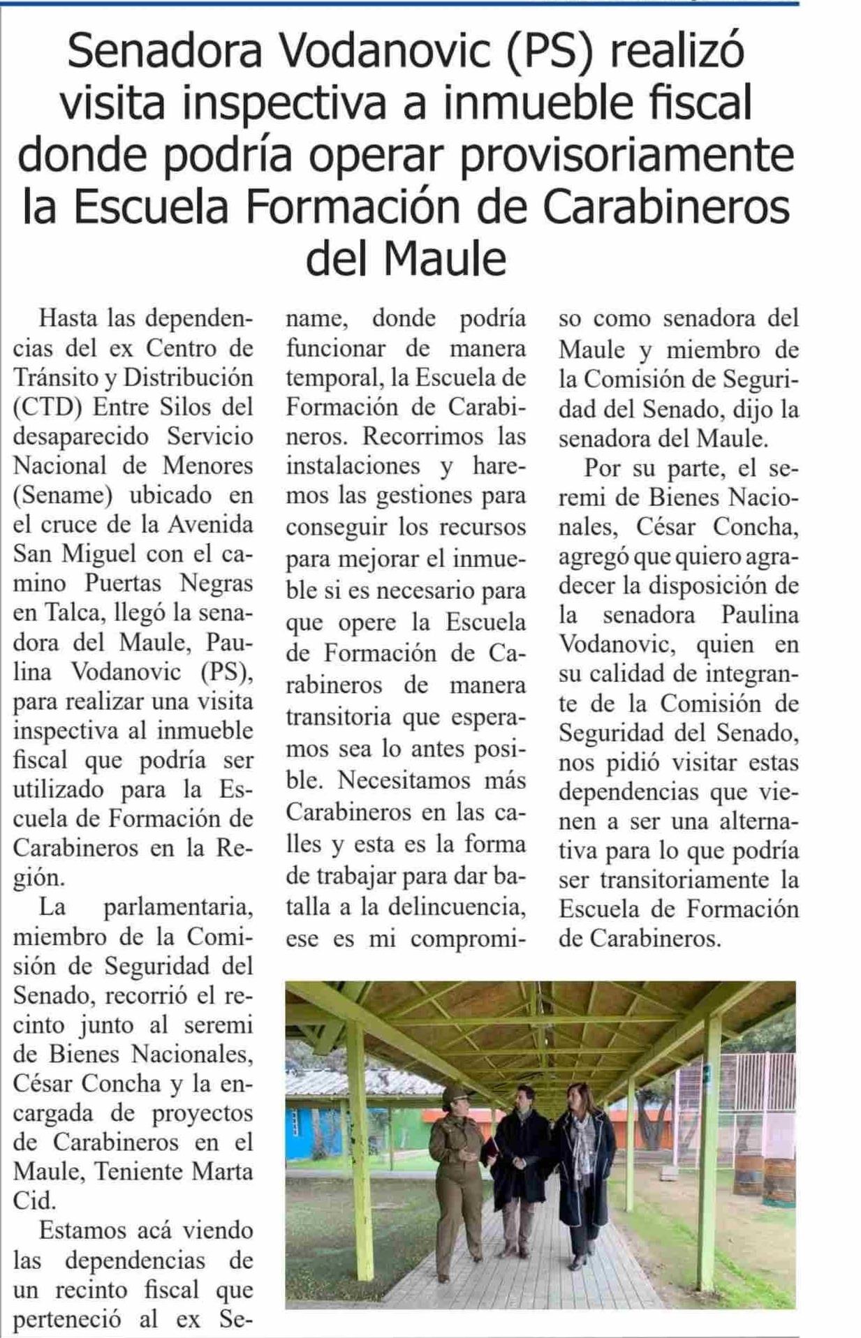 Senadora Vodanovic (PS) realizó visita inspectiva a inmueble fiscal donde podría operar provisoriamente la Escuela Formación de Carabineros del Maule 31-05-2025 El Heraldo |