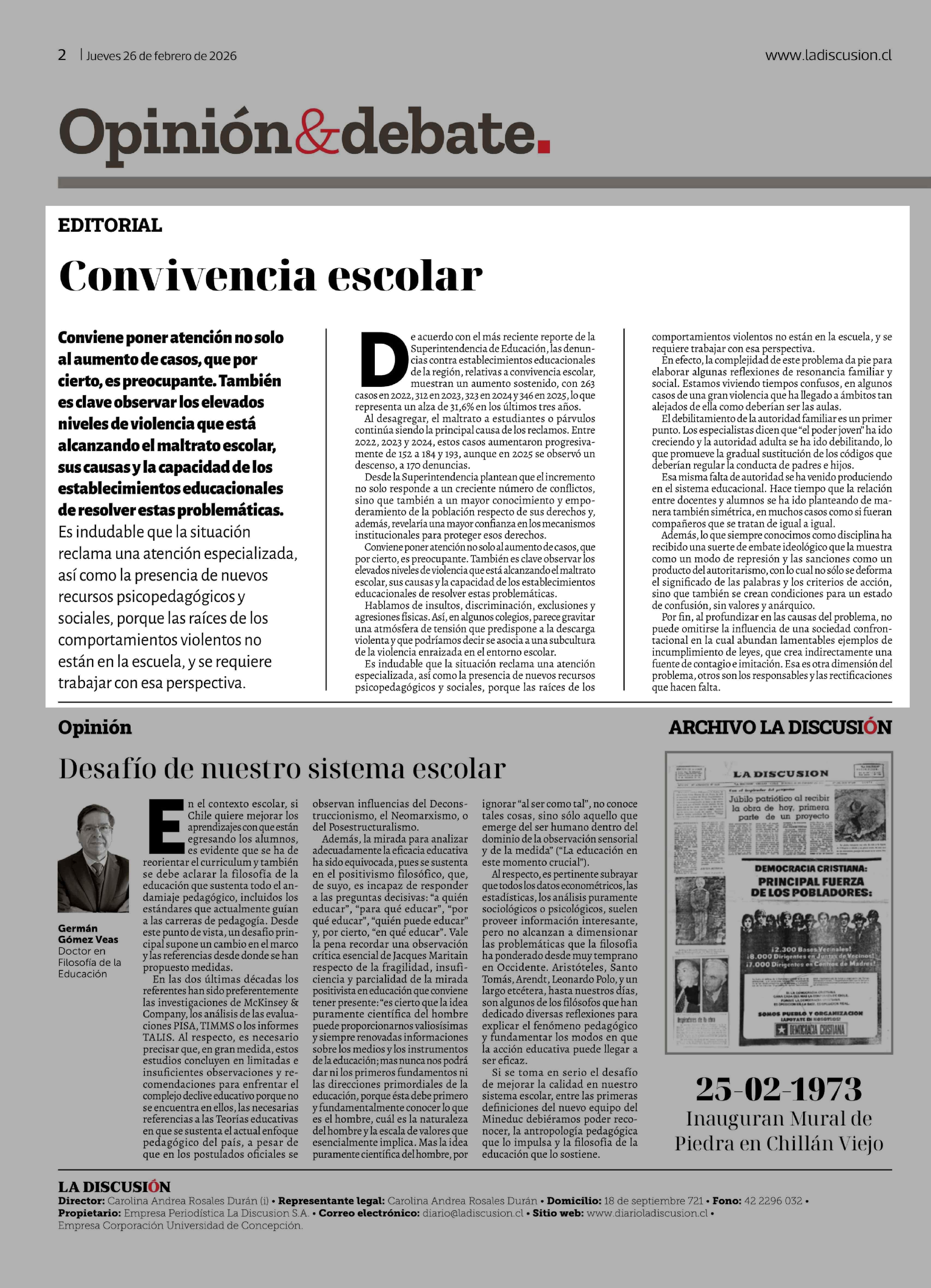 Editorial: Convivencia escolar 26-02-2026 La Discusión |