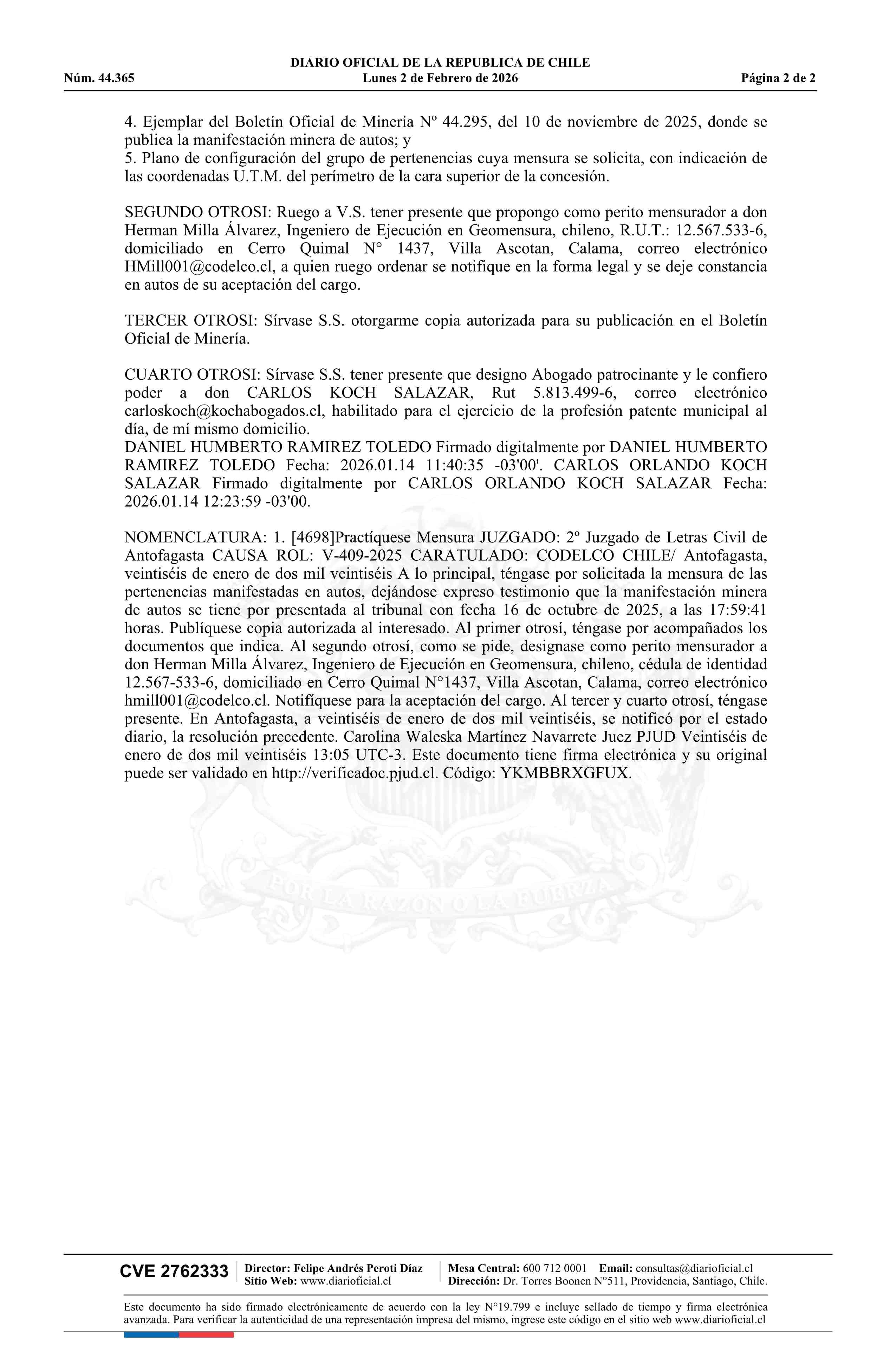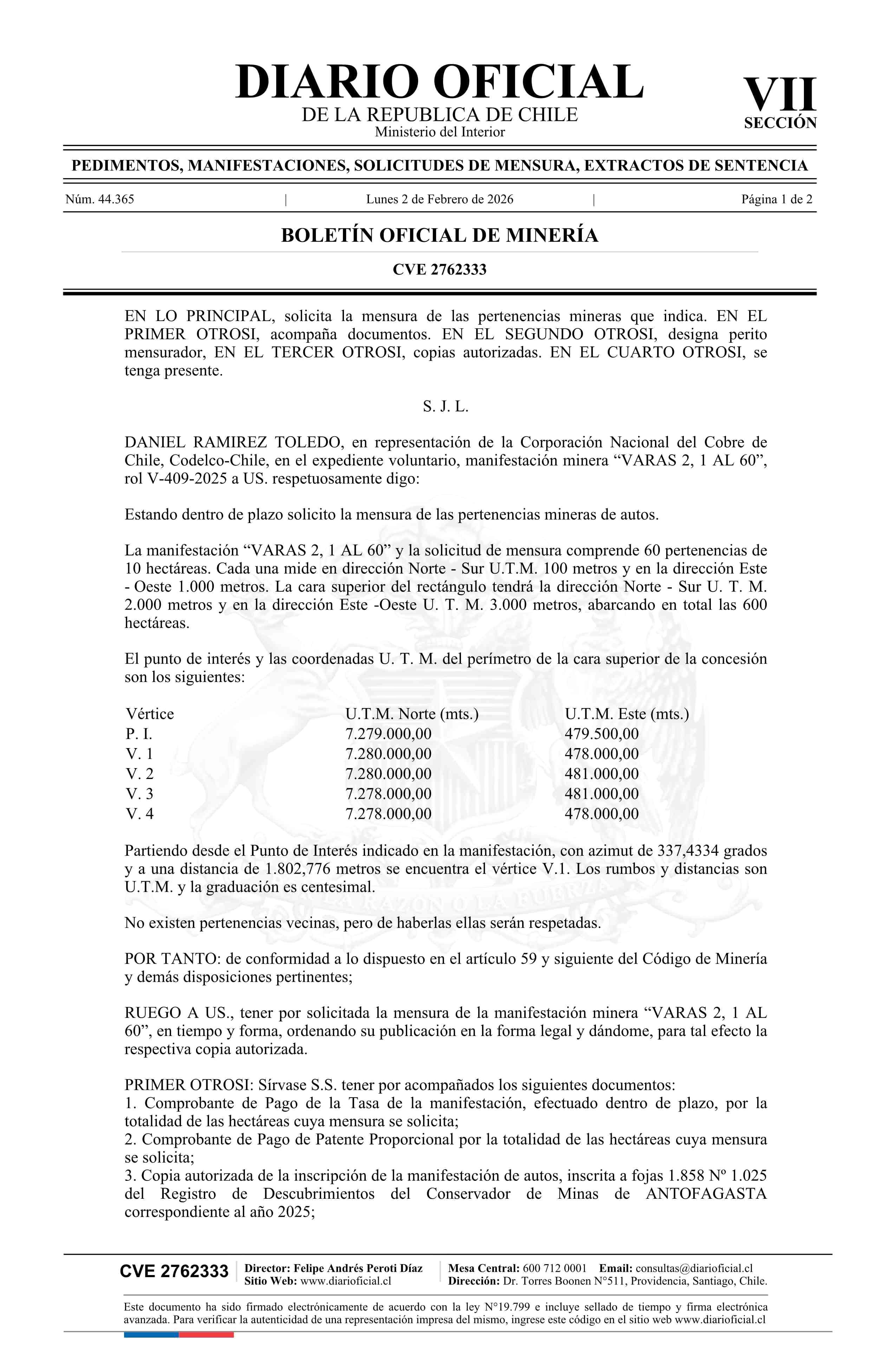 VARAS 2, 1 AL 60 / Corporación Nacional del Cobre de Chile 02-02-2026 DIARIO OFICIAL CHILE - BOLETÍN OFICIAL DE MINERÍA |