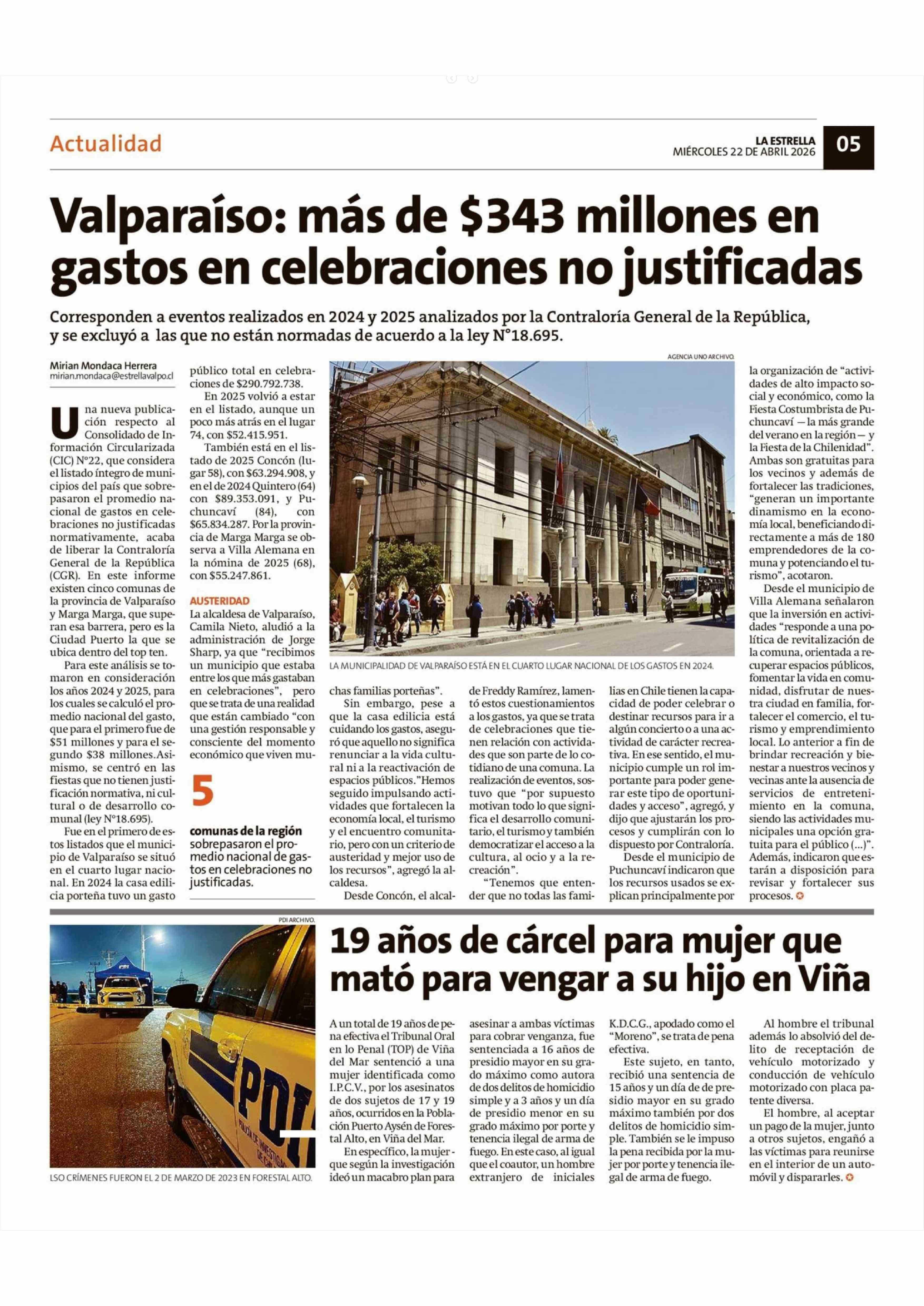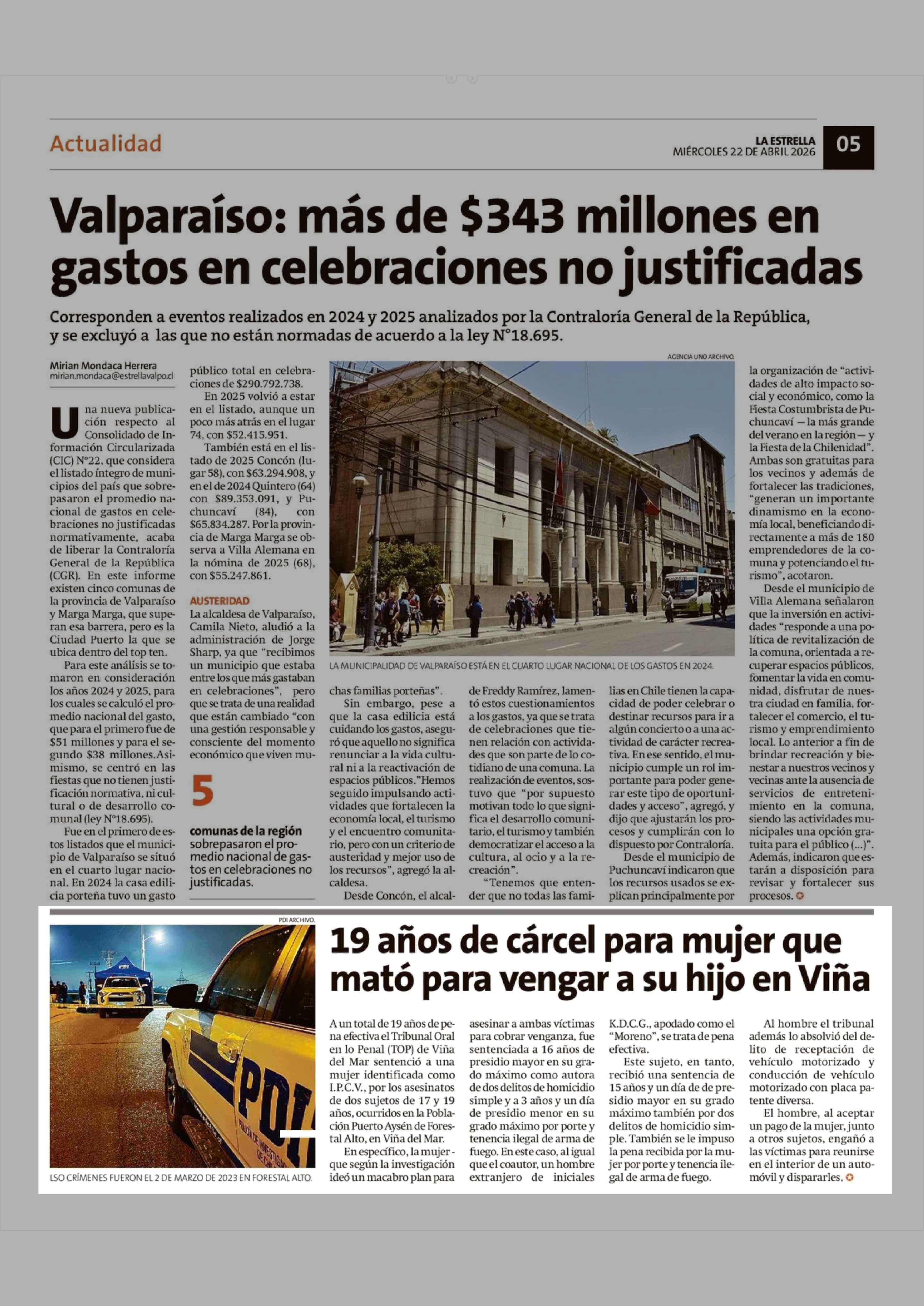 19 Años de cárcel para mujer que mató para vengar a su hijo en Viña 22-04-2026 La Estrella de Valparaíso |