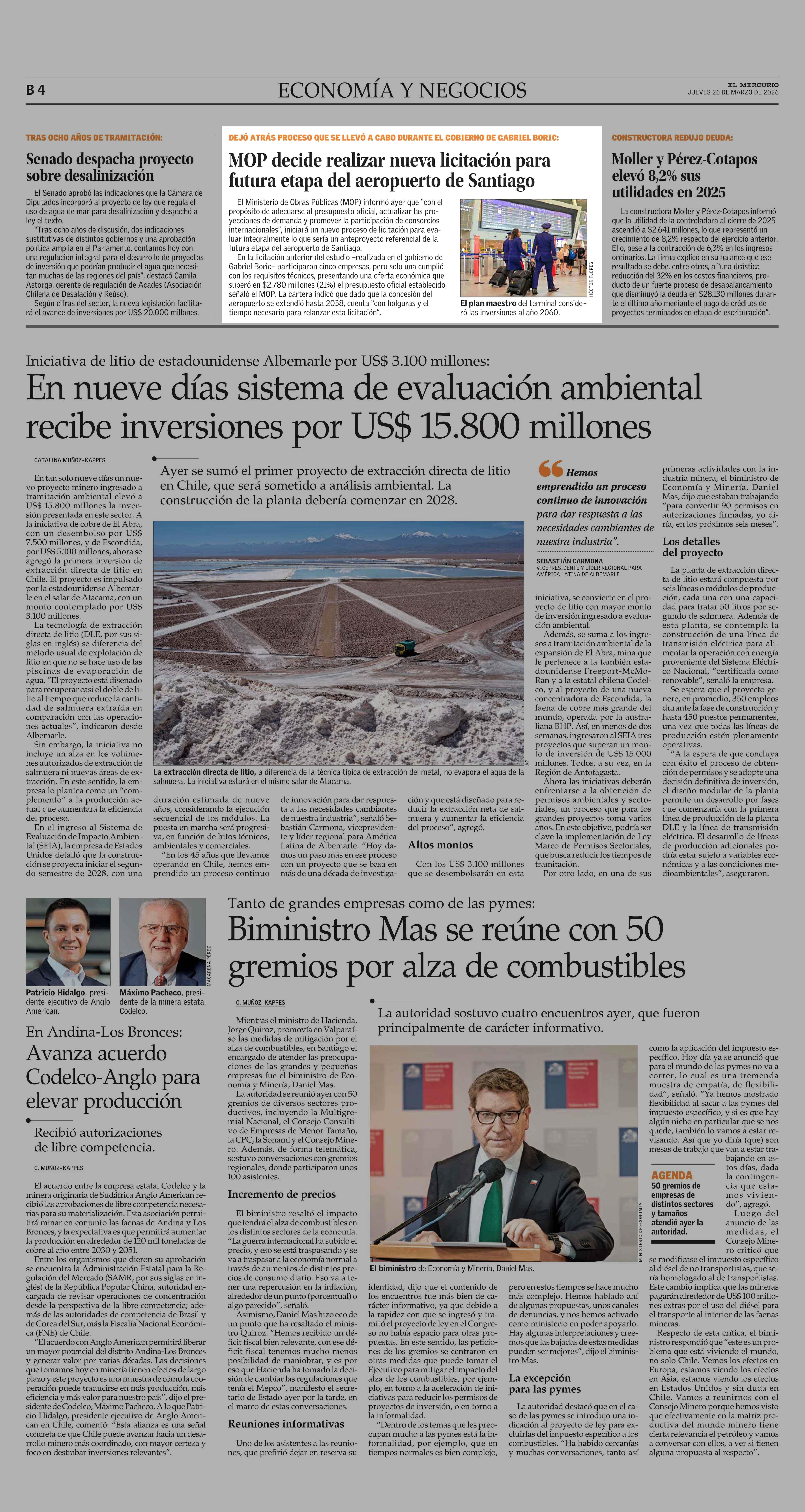 MOP decide realizar nueva licitación para futura etapa del aeropuerto de Santiago 26-03-2026 El Mercurio |