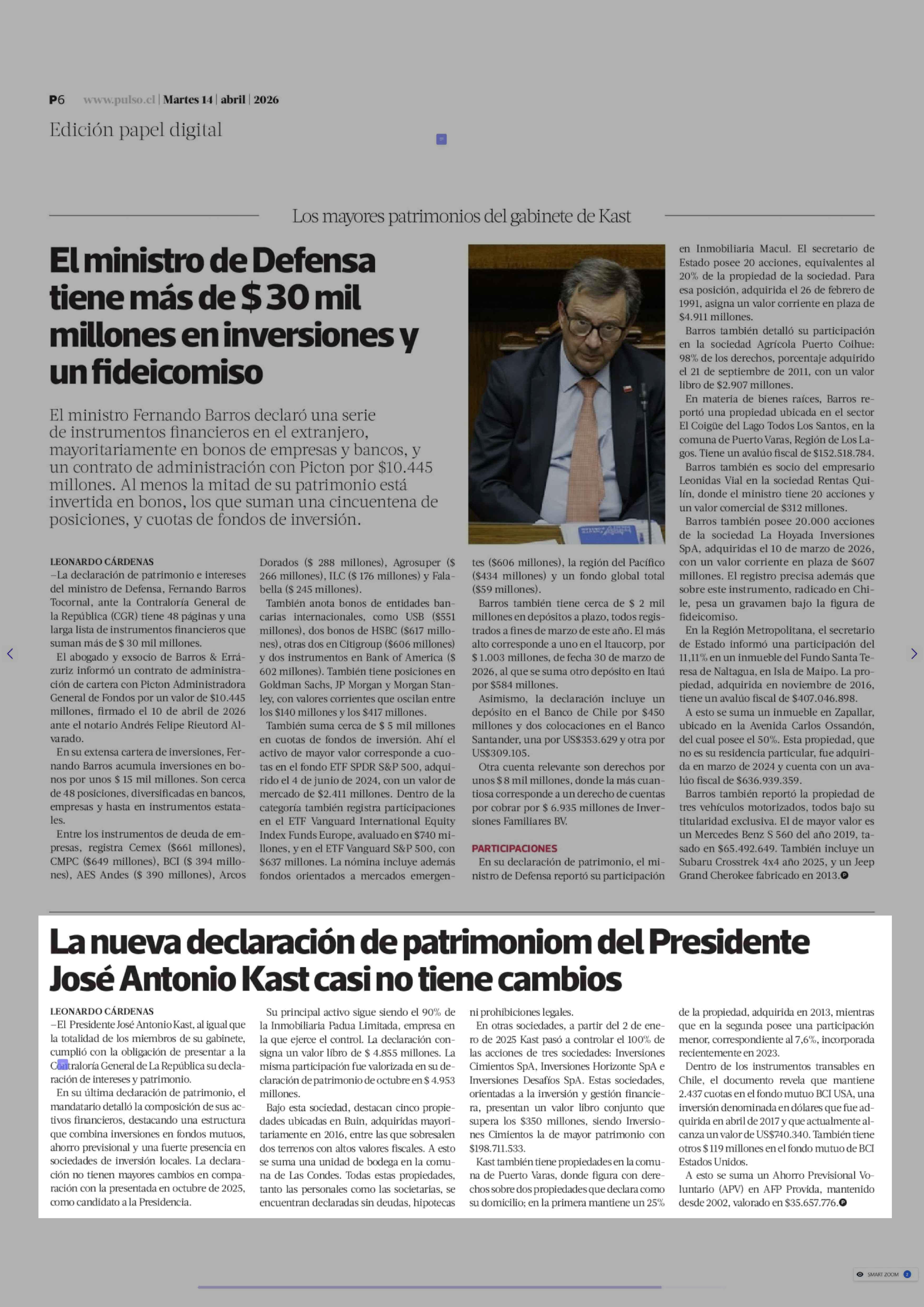 La nueva declaración de patrimoniom del Presidente José Antonio Kast casi no tiene cambios 14-04-2026 La Tercera |