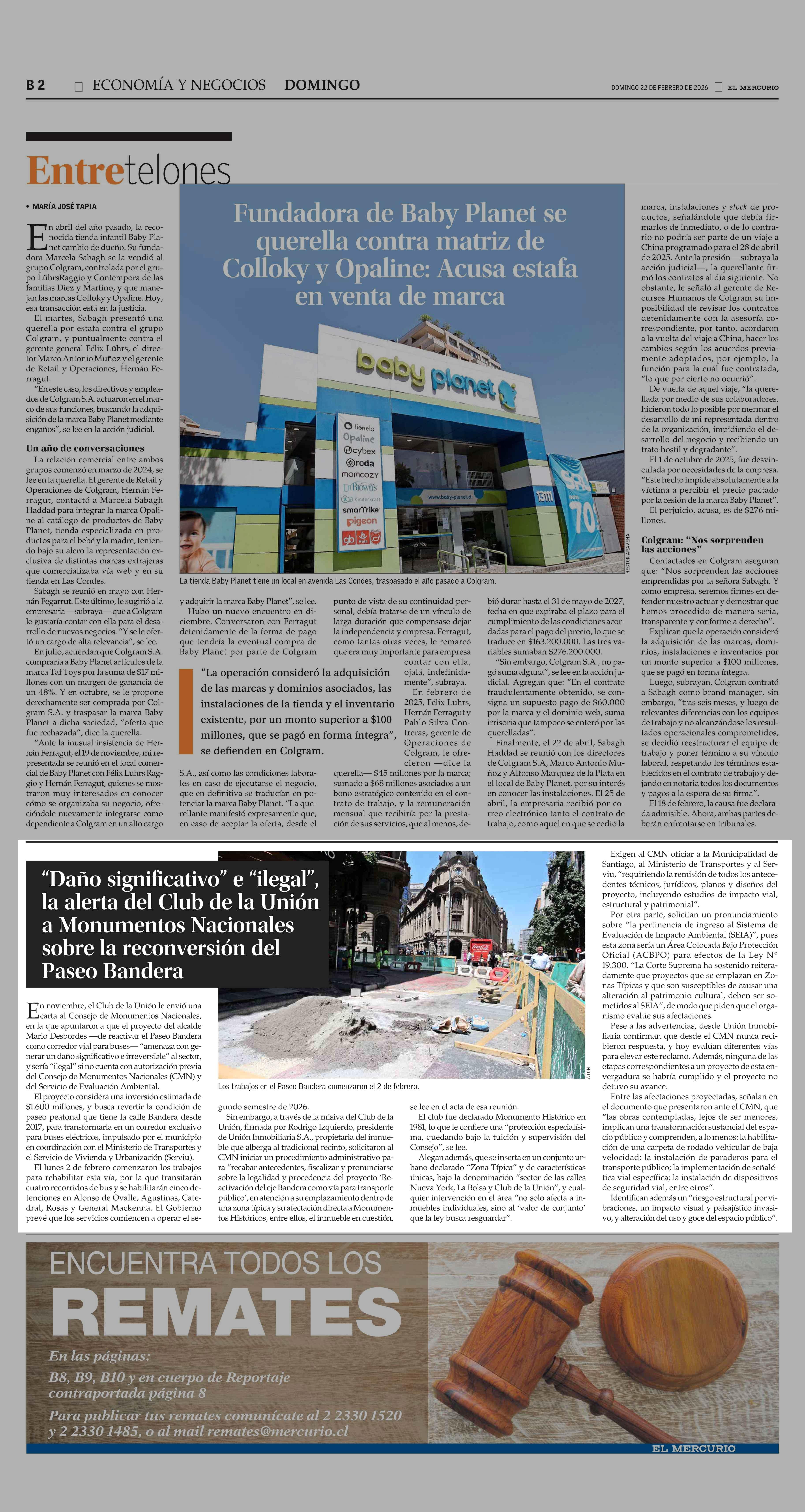 "Daño significativo" e "ilegal", la alerta del Club de La Unión a Monumentos Nacionales sobre reconversión del Paseo Bandera 22-02-2026 El Mercurio |