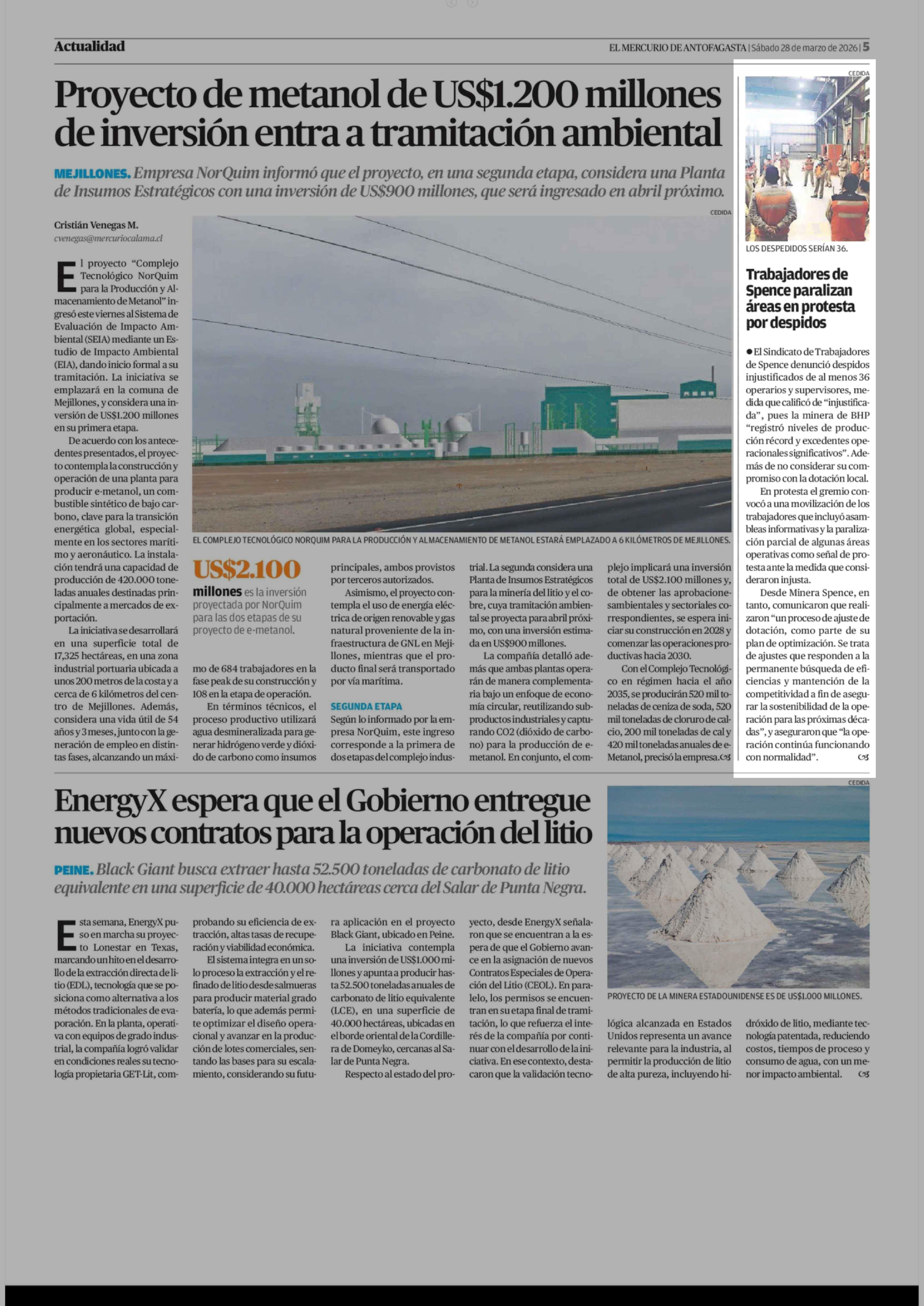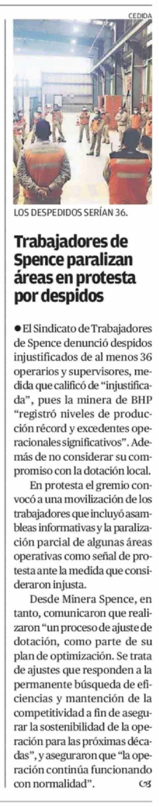Trabajadores de Spence paralizan áreas en protesta por despidos 28-03-2026 El Mercurio de Antofagasta |