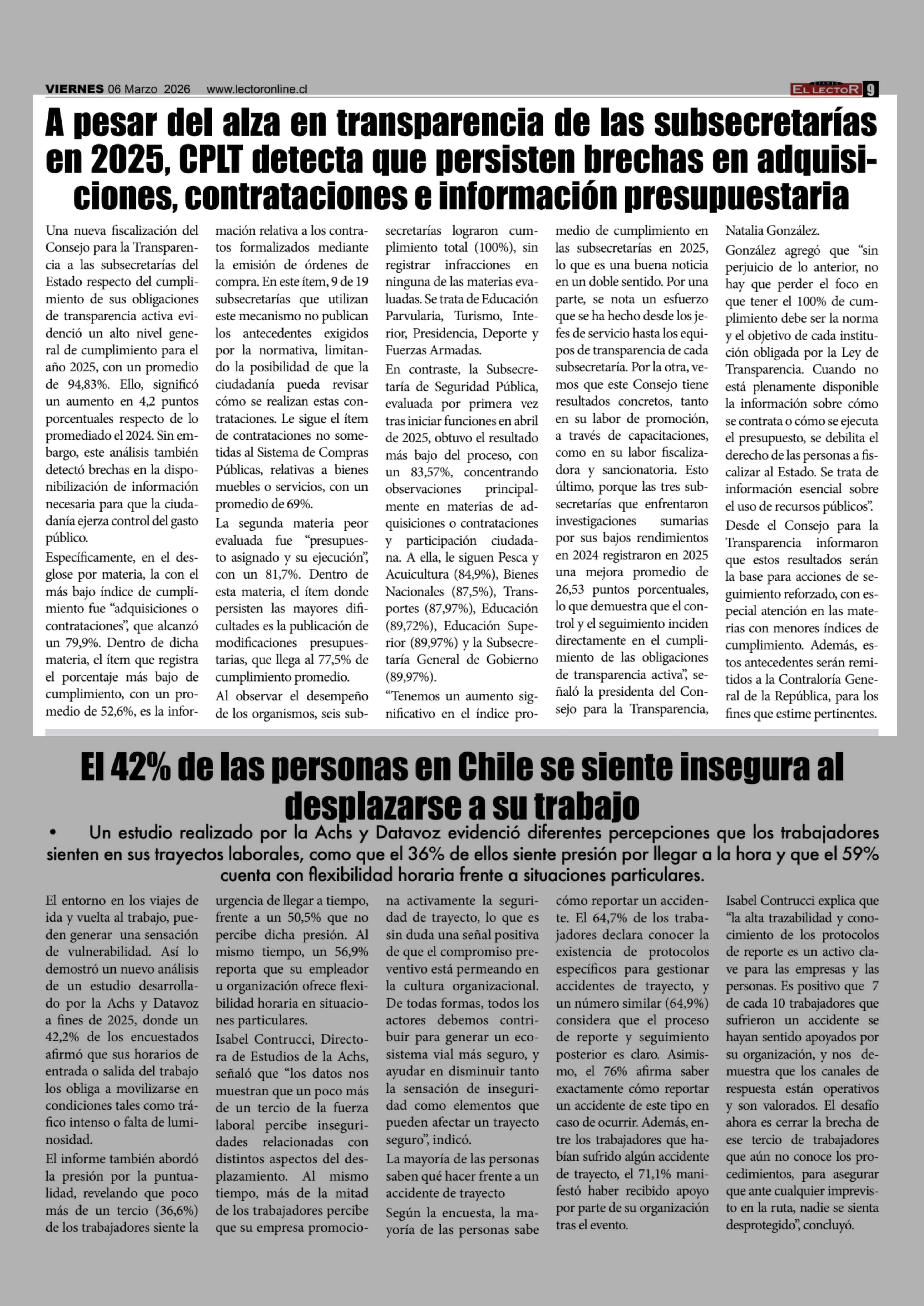 A pesar del alza en transparencia de las subsecretarías en 2025, CPLT detecta que persisten brechas en adquisiciones, contrataciones e información presupuestaria 06-03-2026 El Lector |