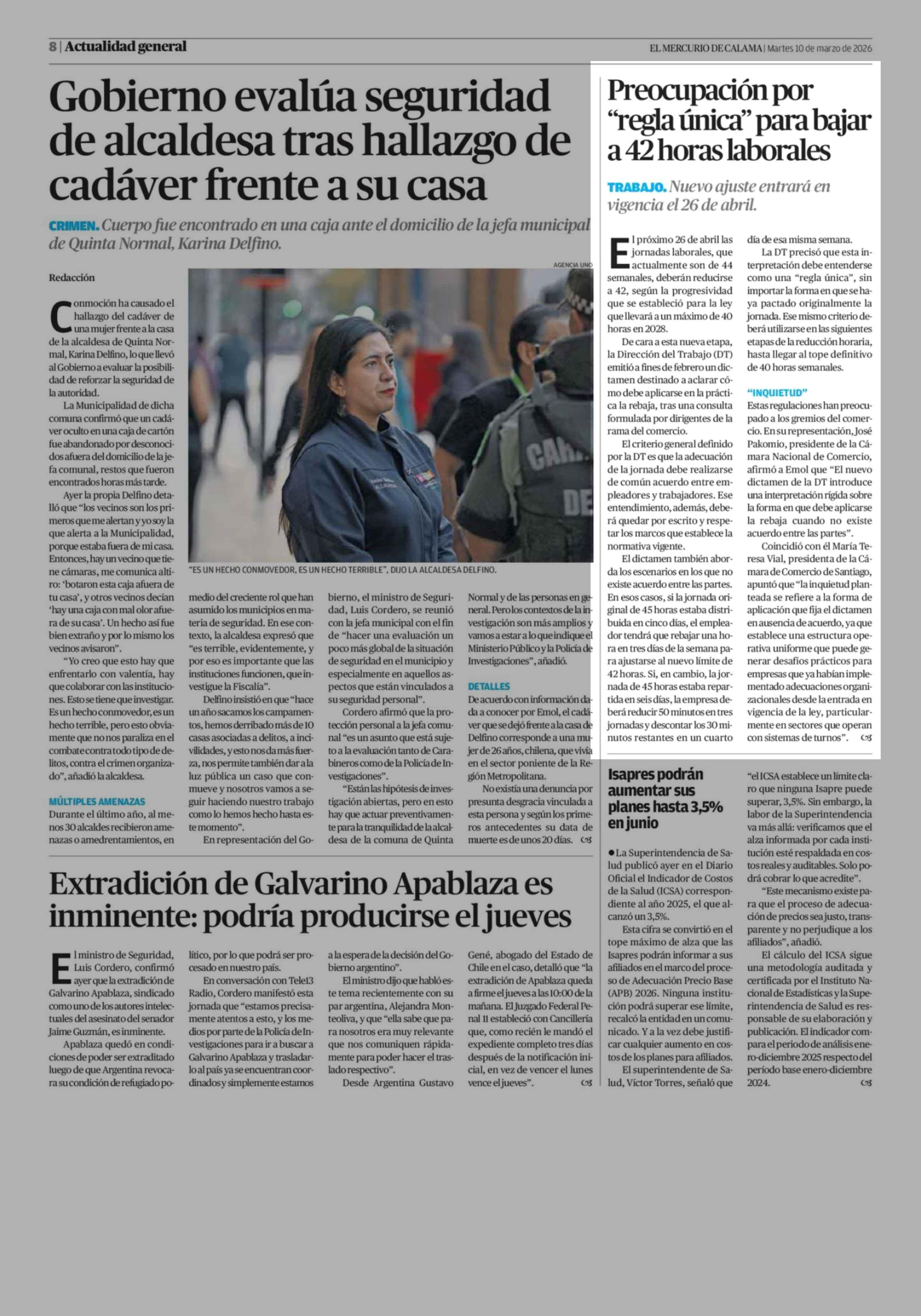Preocupación por "regla única" para bajar a 42 horas laborales 10-03-2026 El Mercurio de Calama |