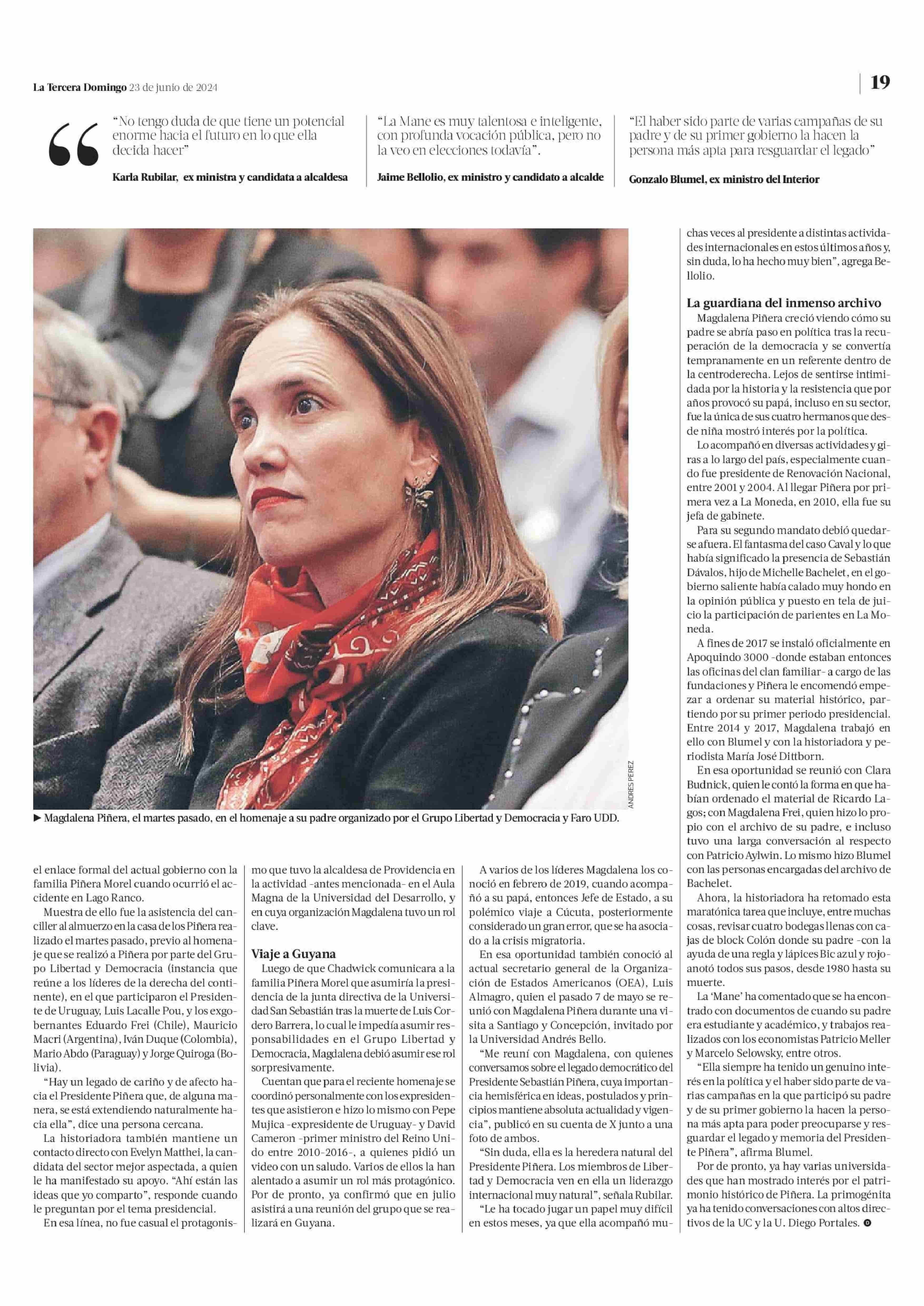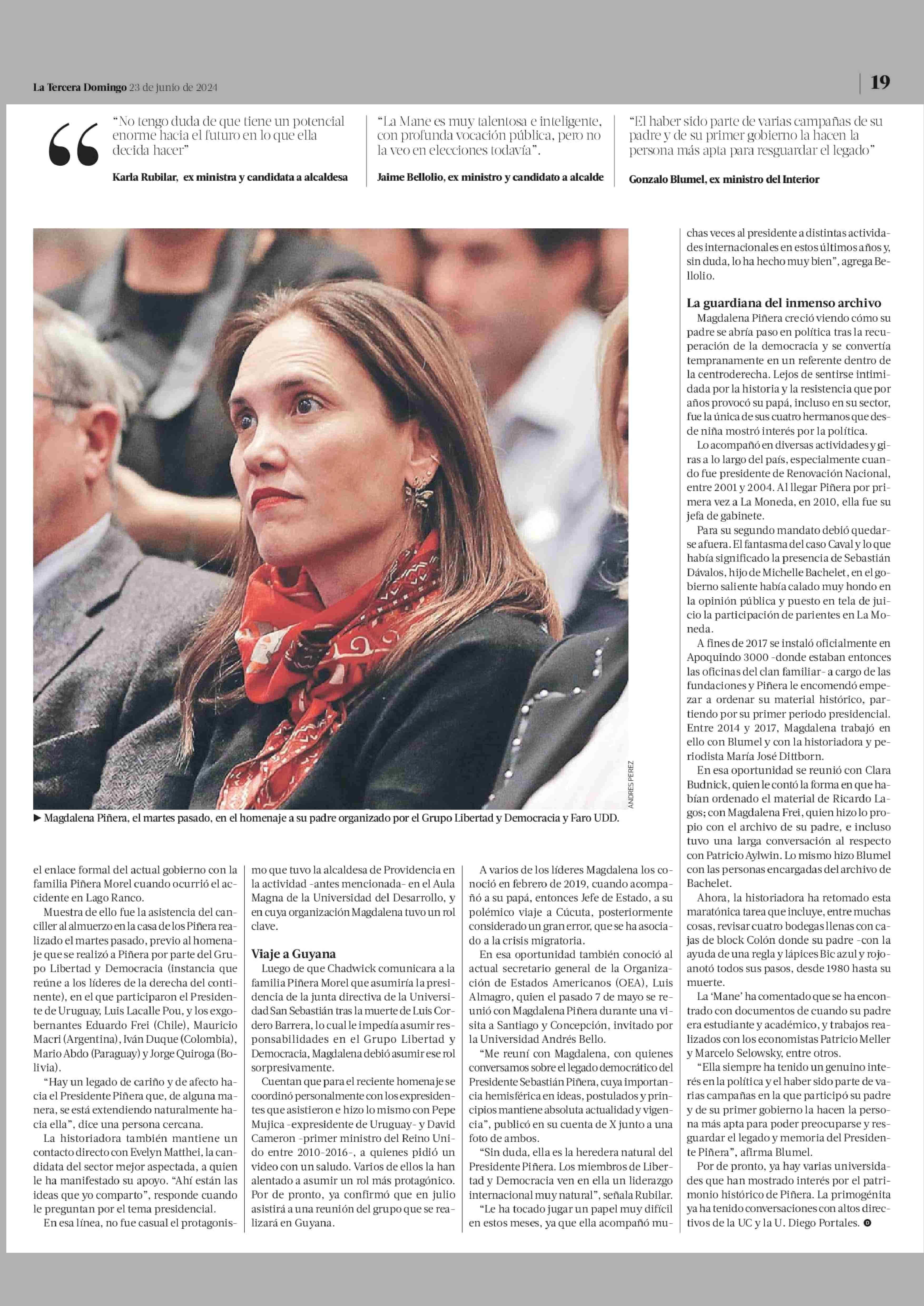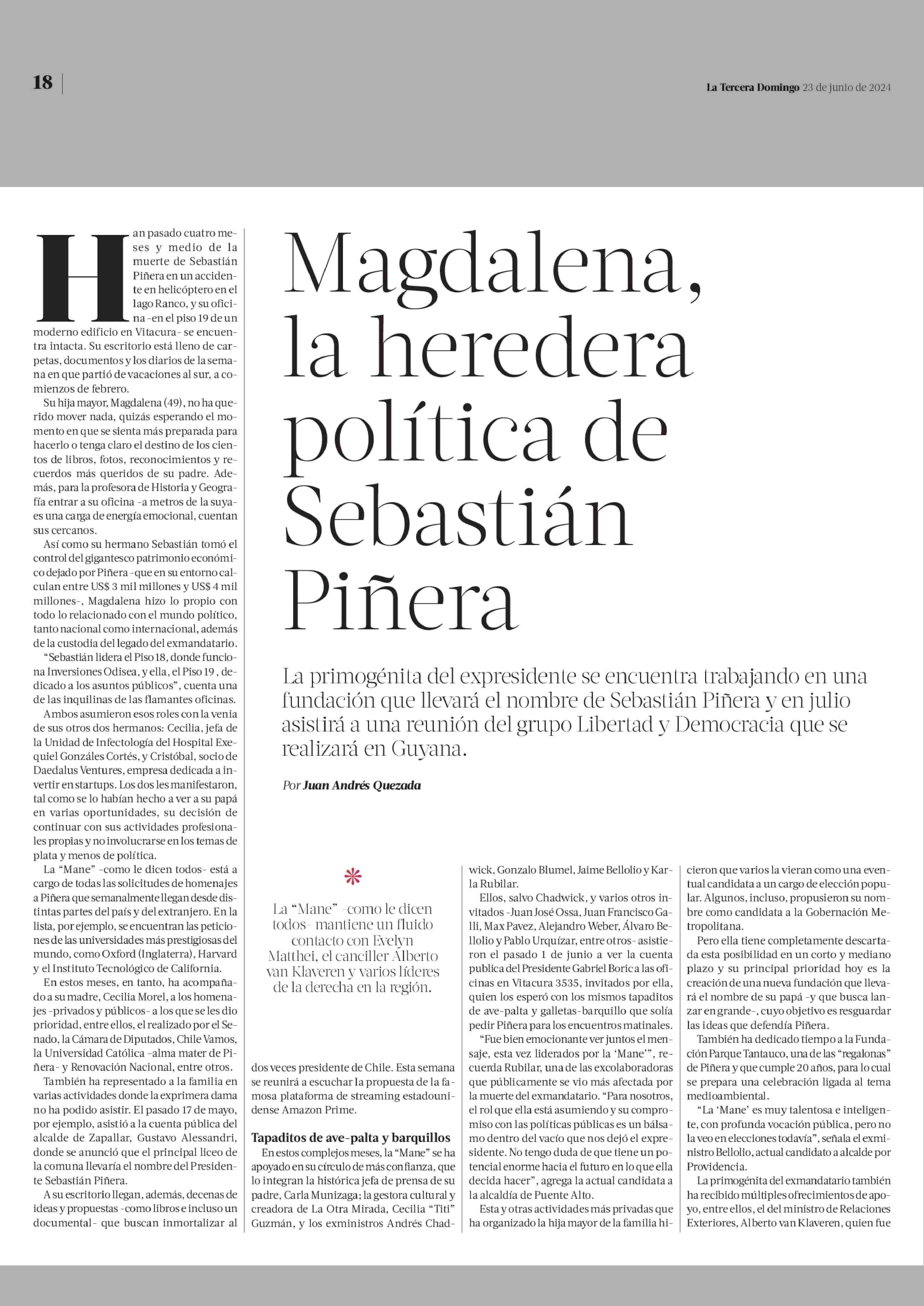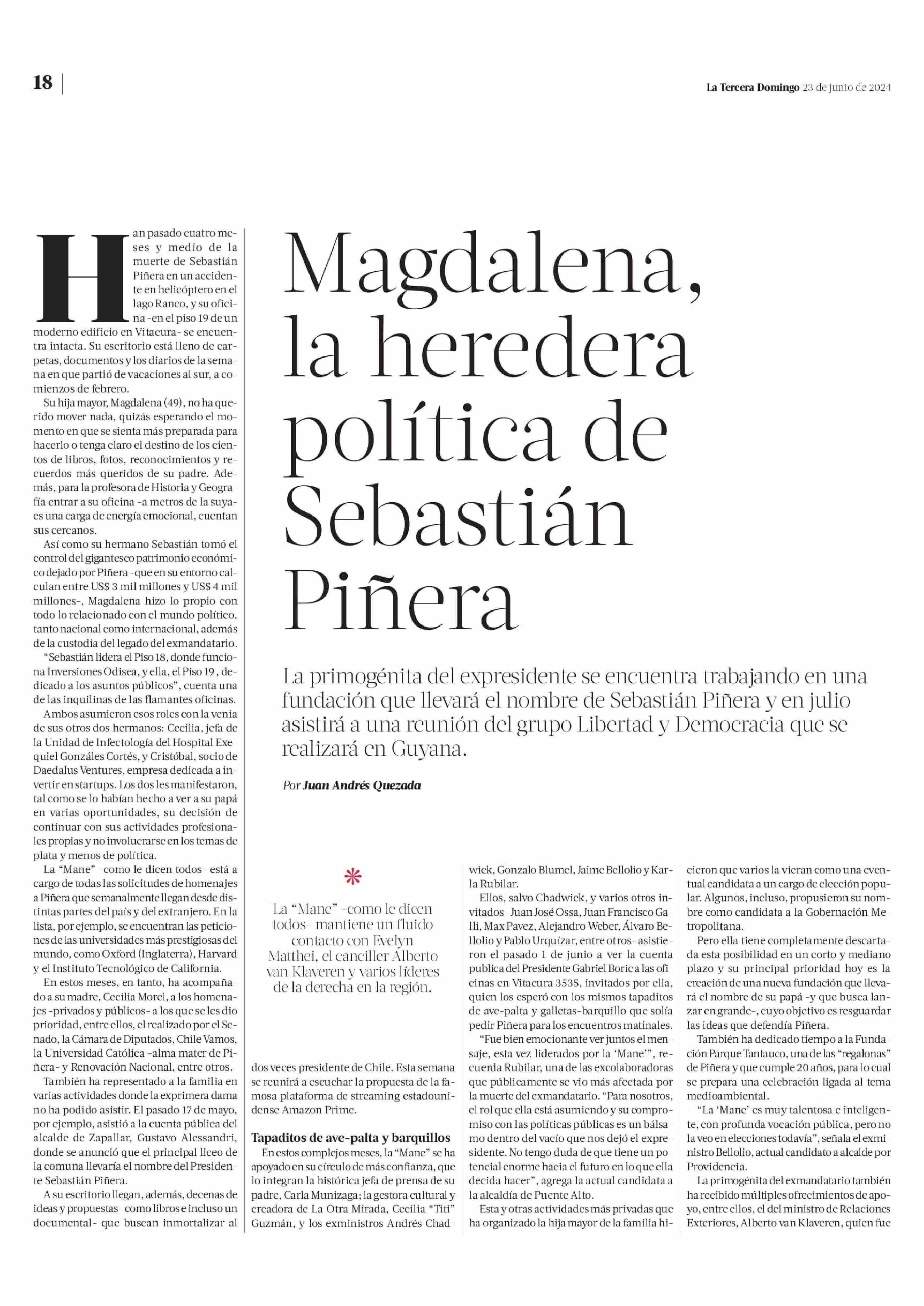 Magdalena, la heredera política de Sebastián Piñera 23-06-2024 La Tercera |