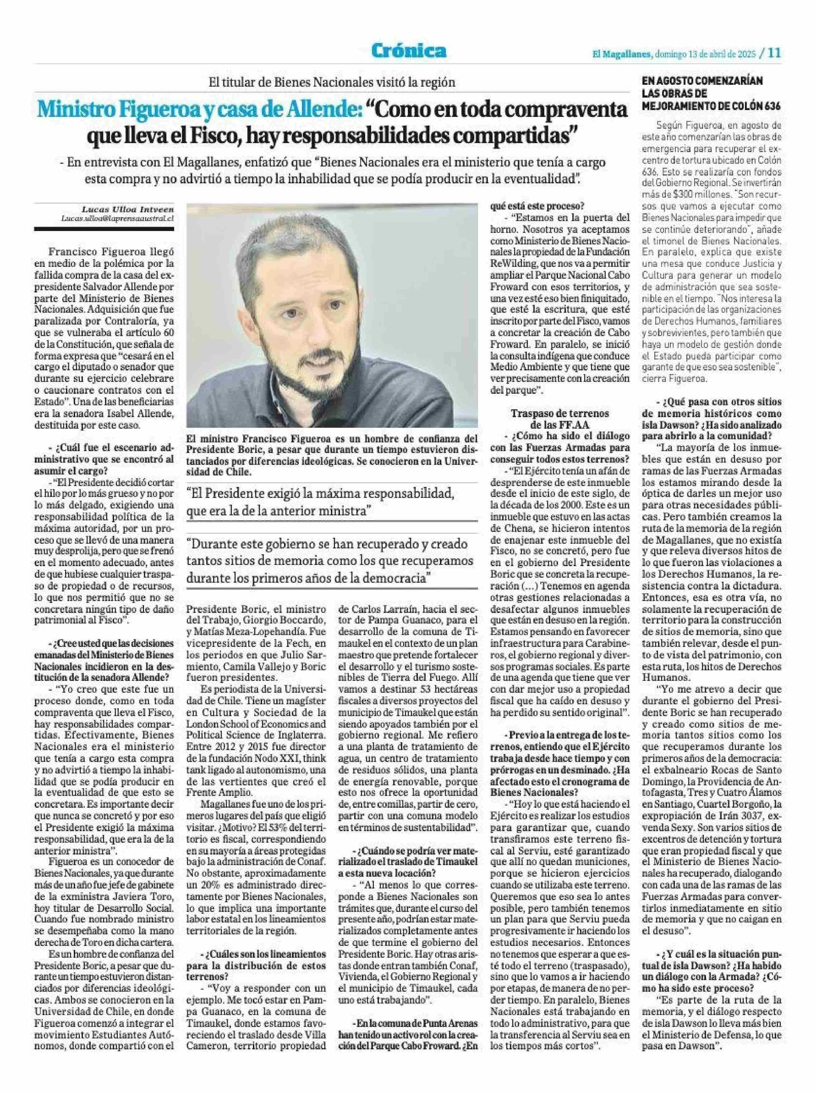 Ministro Figueroa y casa de Allende: “Como en toda compraventa que lleva el Fisco, hay responsabilidades compartidas” 13-04-2025 El Magallanes |