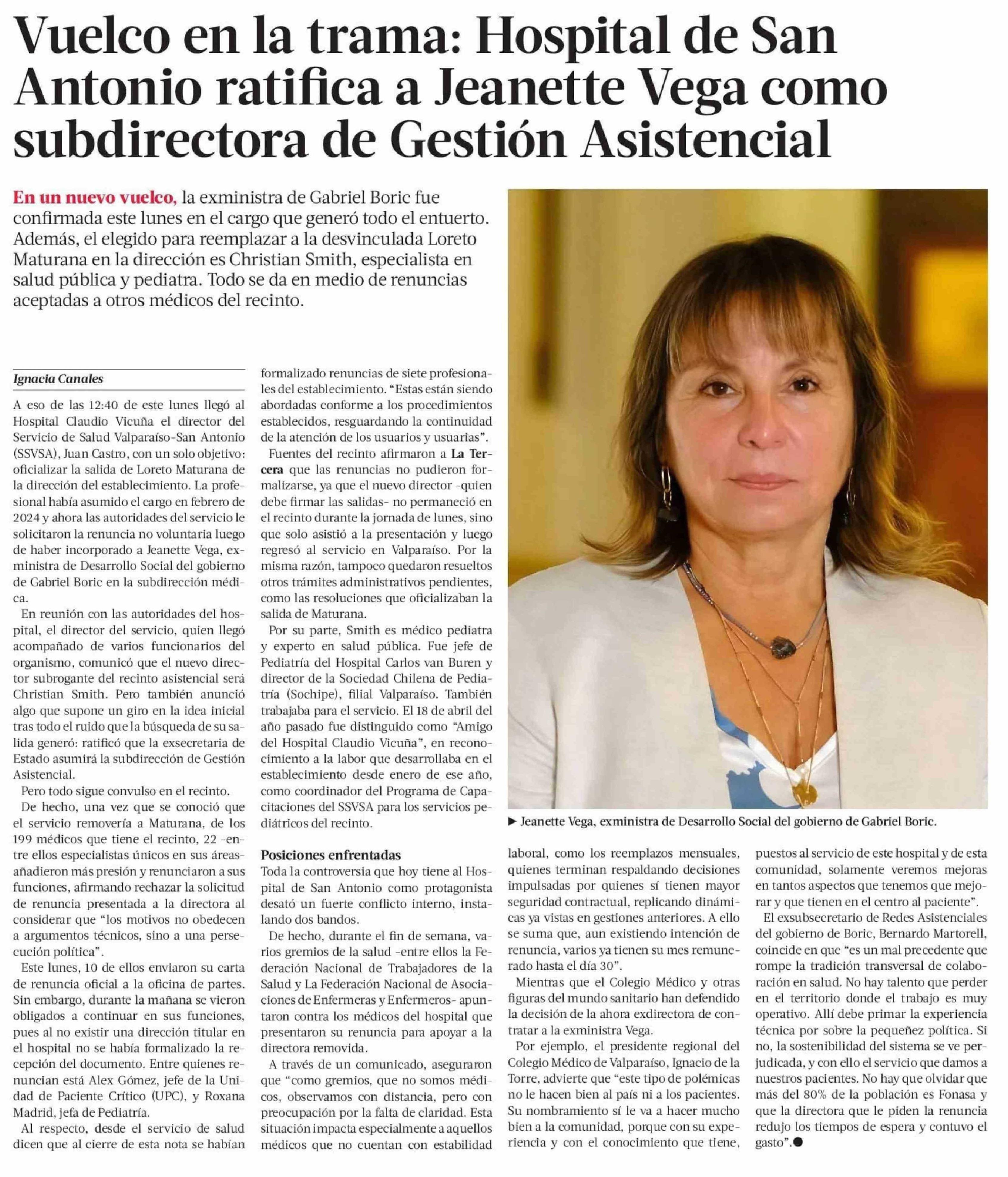 Vuelco en la trama: Hospital de San Antonio ratifica a Jeanette Vega como subdirectora de Gestión Asistencial 28-04-2026 La Tercera |