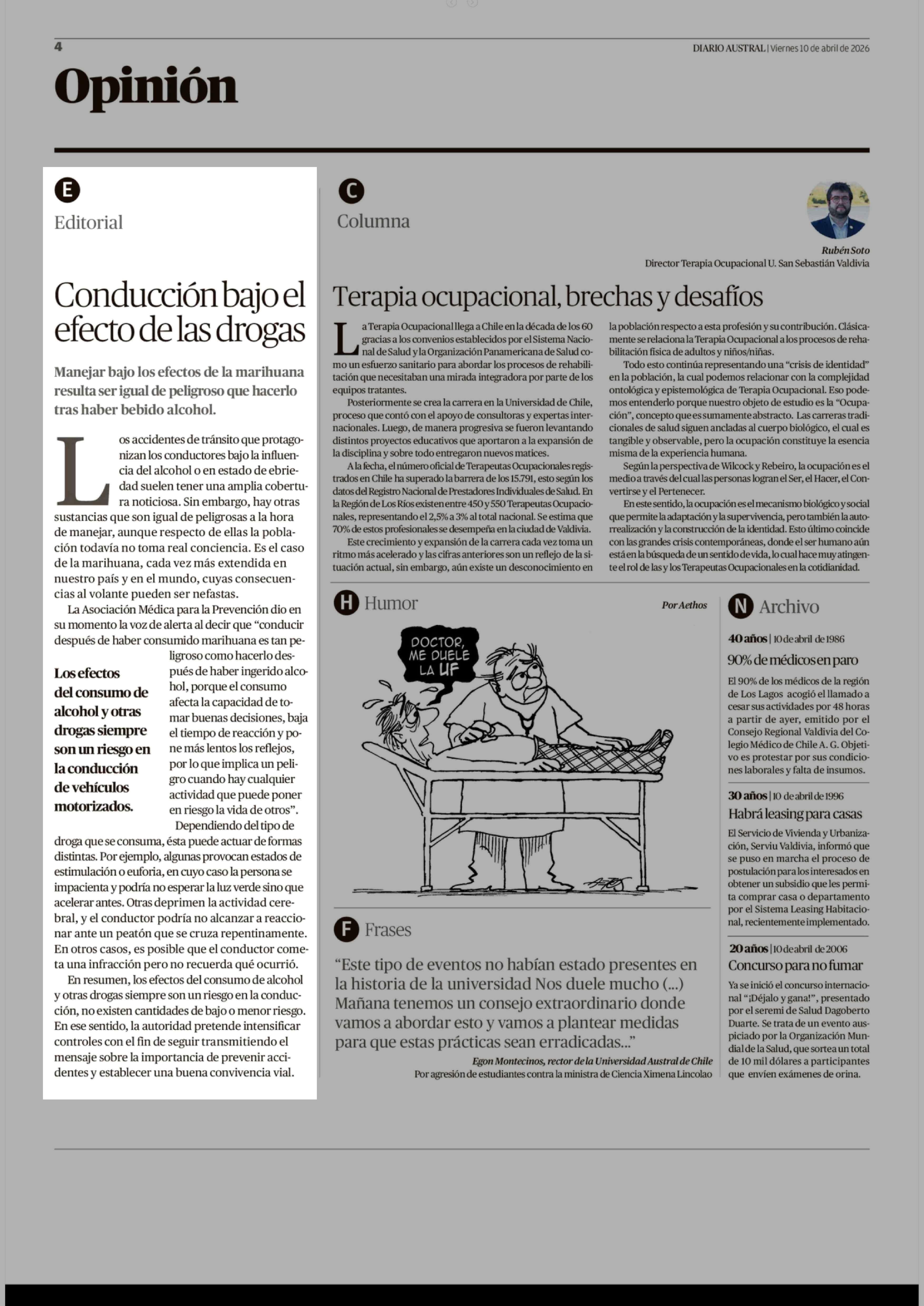 Editorial: Conducción bajo el efecto de las drogas 10-04-2026 Diario Austral Región de Los Ríos |