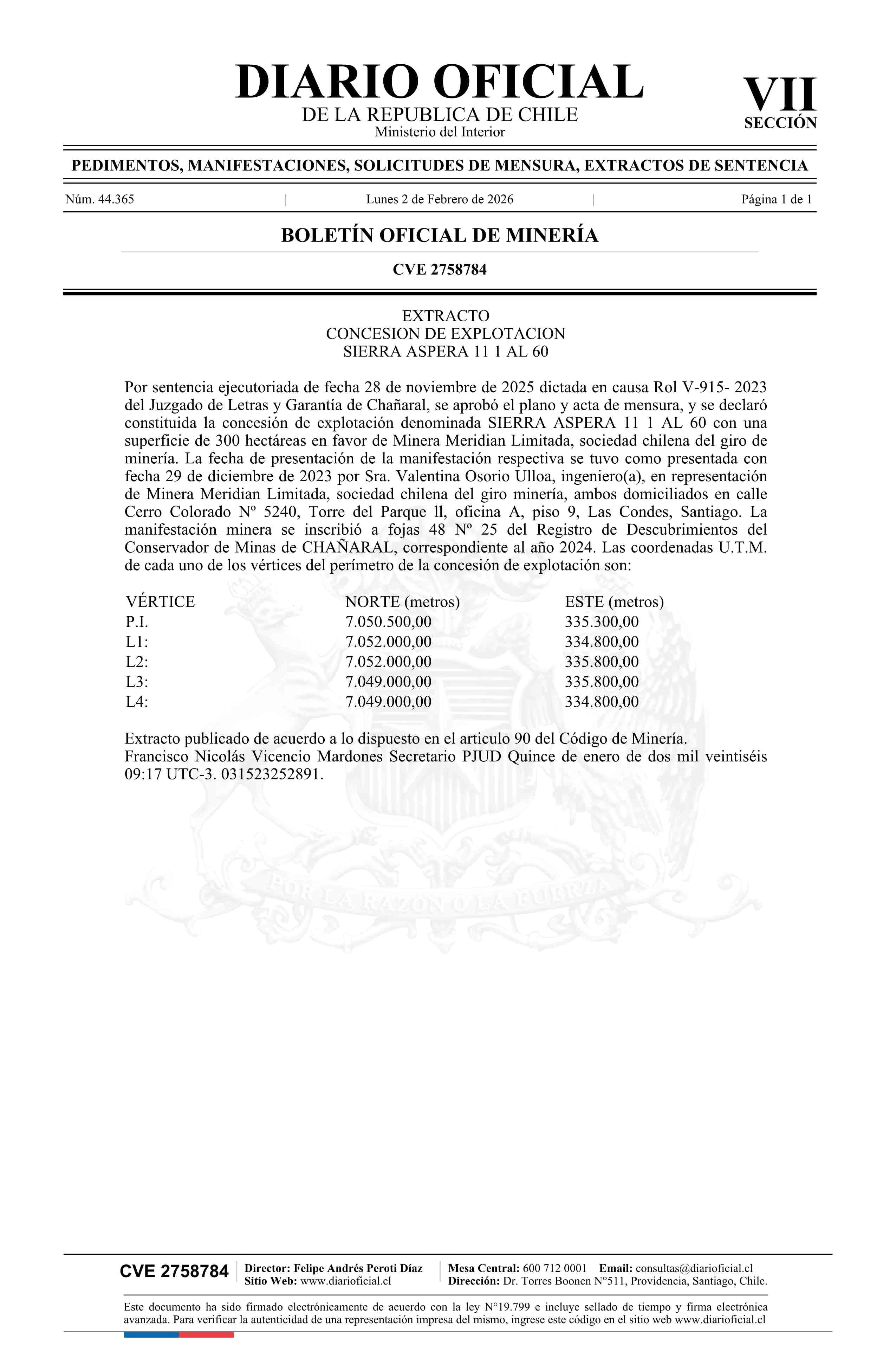 Título: SIERRA ASPERA 11 1 AL 60 / Minera Meridian Limitada