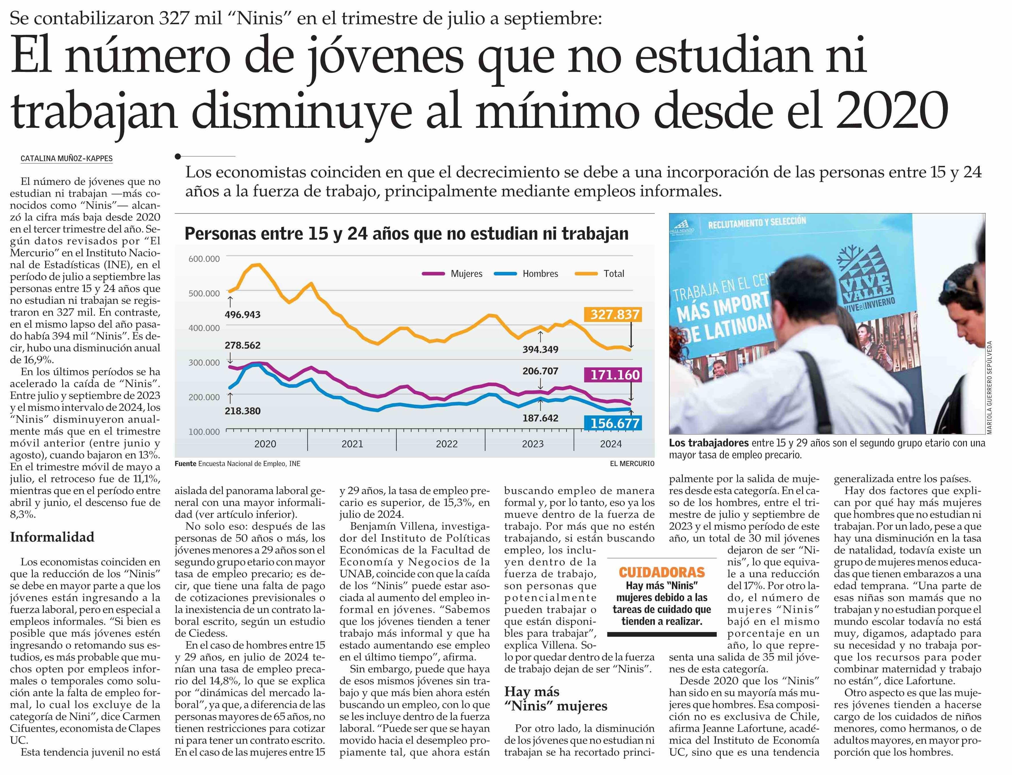 El número de jóvenes que no estudian ni trabajan disminuye al mínimo desde el 2020 30-10-2024 El Mercurio |