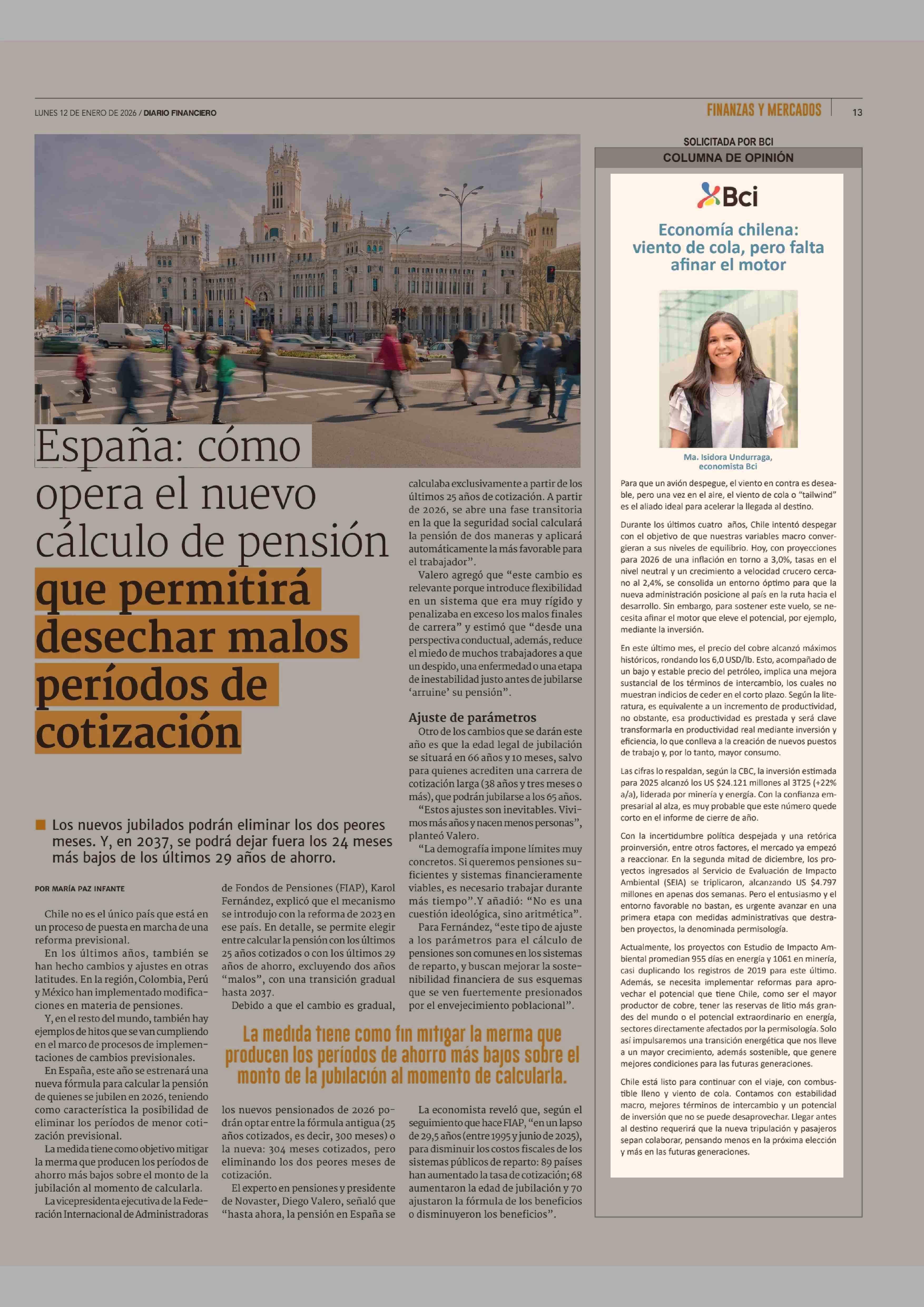 Columnas de Opinión: Economía chilena: viento de cola, pero falta afinar el motor 12-01-2026 Diario Financiero |