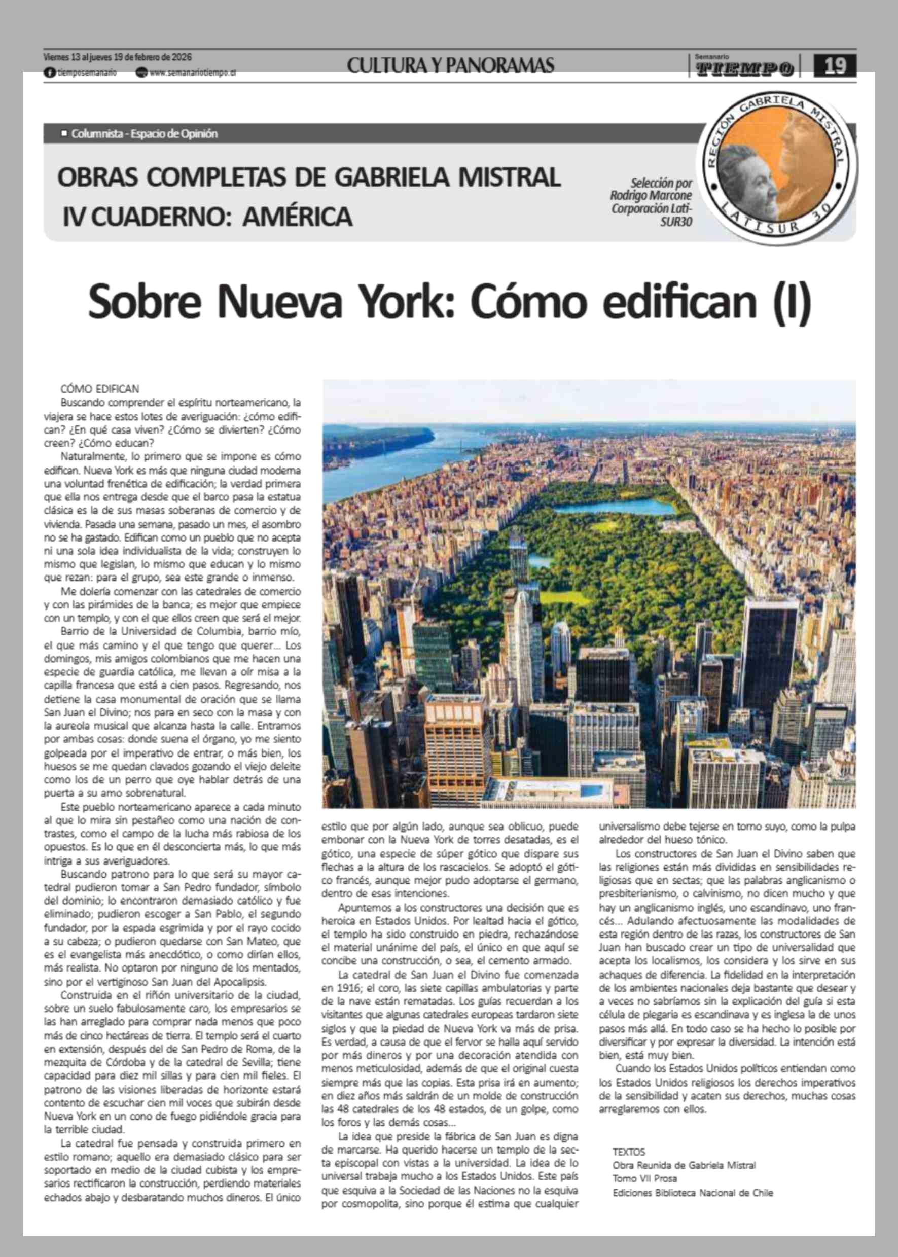 Columnas de Opinión: Sobre Nueva York: Cómo edifican 13-02-2026 Semanario Tiempo |