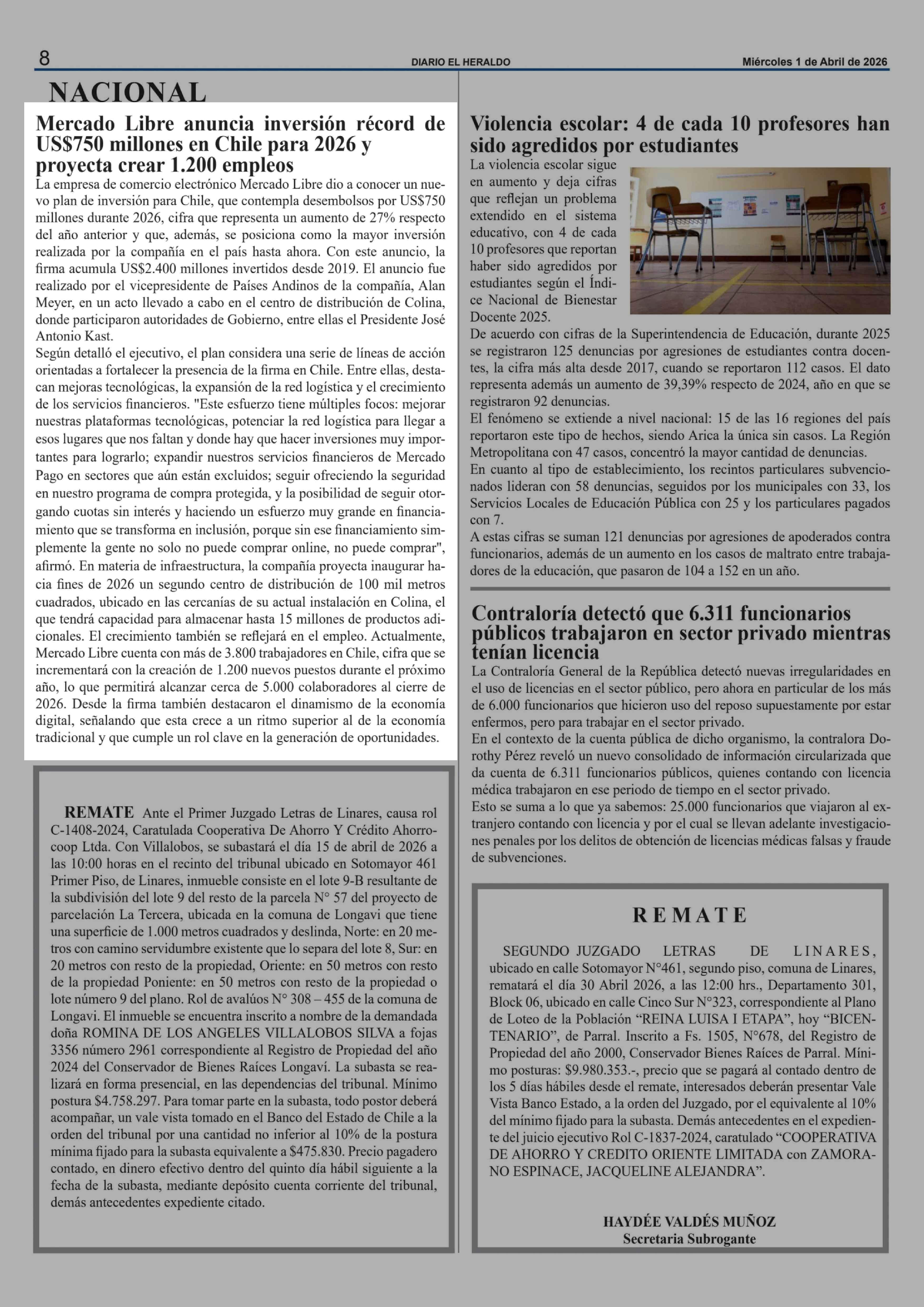 Mercado Libre anuncia inversión récord de US$750 millones en Chile para 2026 y proyecta crear 1.200 empleos 01-04-2026 El Heraldo |