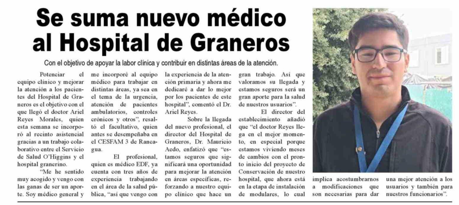 Se suma nuevo médico al Hospital de Graneros 27-05-2025 Diario VI Región |