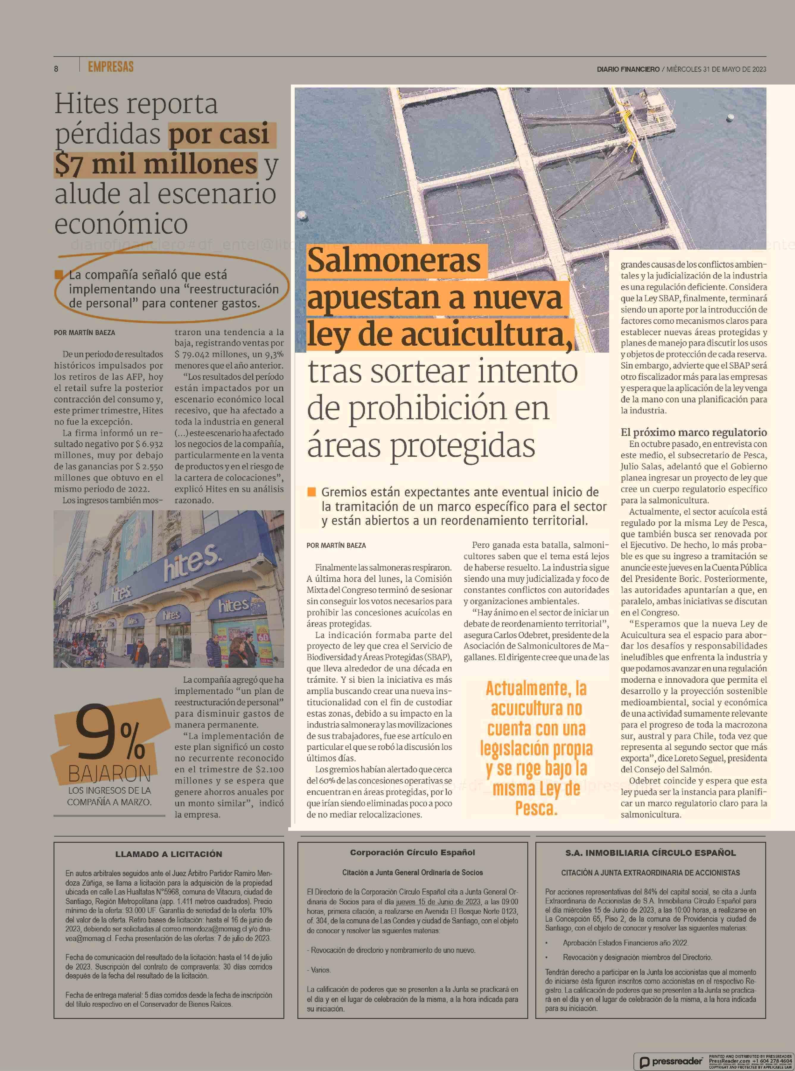 Salmoneras apuestan a nueva ley de acuicultura, tras sortear intento de prohibición en áreas protegidas 31-05-2023 Diario Financiero |