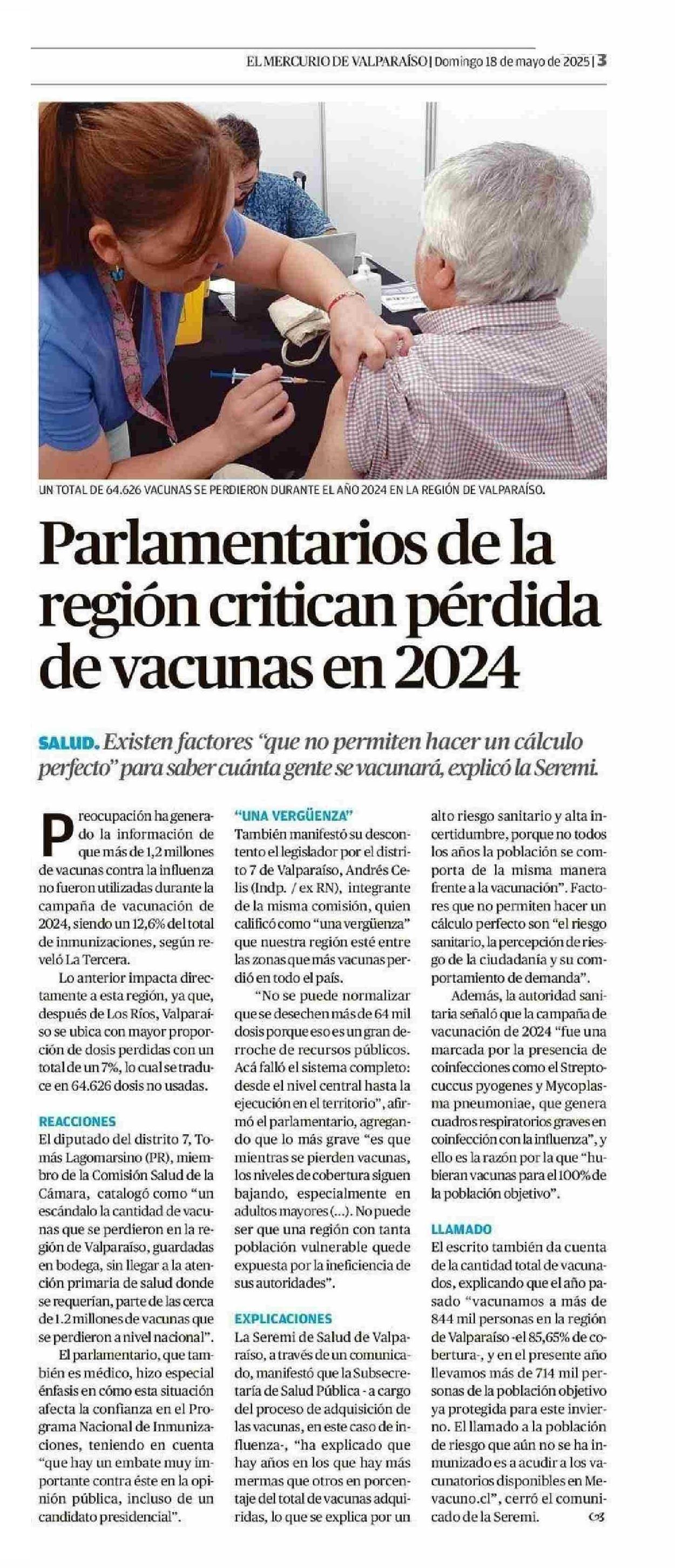 Parlamentarios de la región critican pérdida de vacunas en 2024 18-05-2025 El Mercurio de Valparaíso |