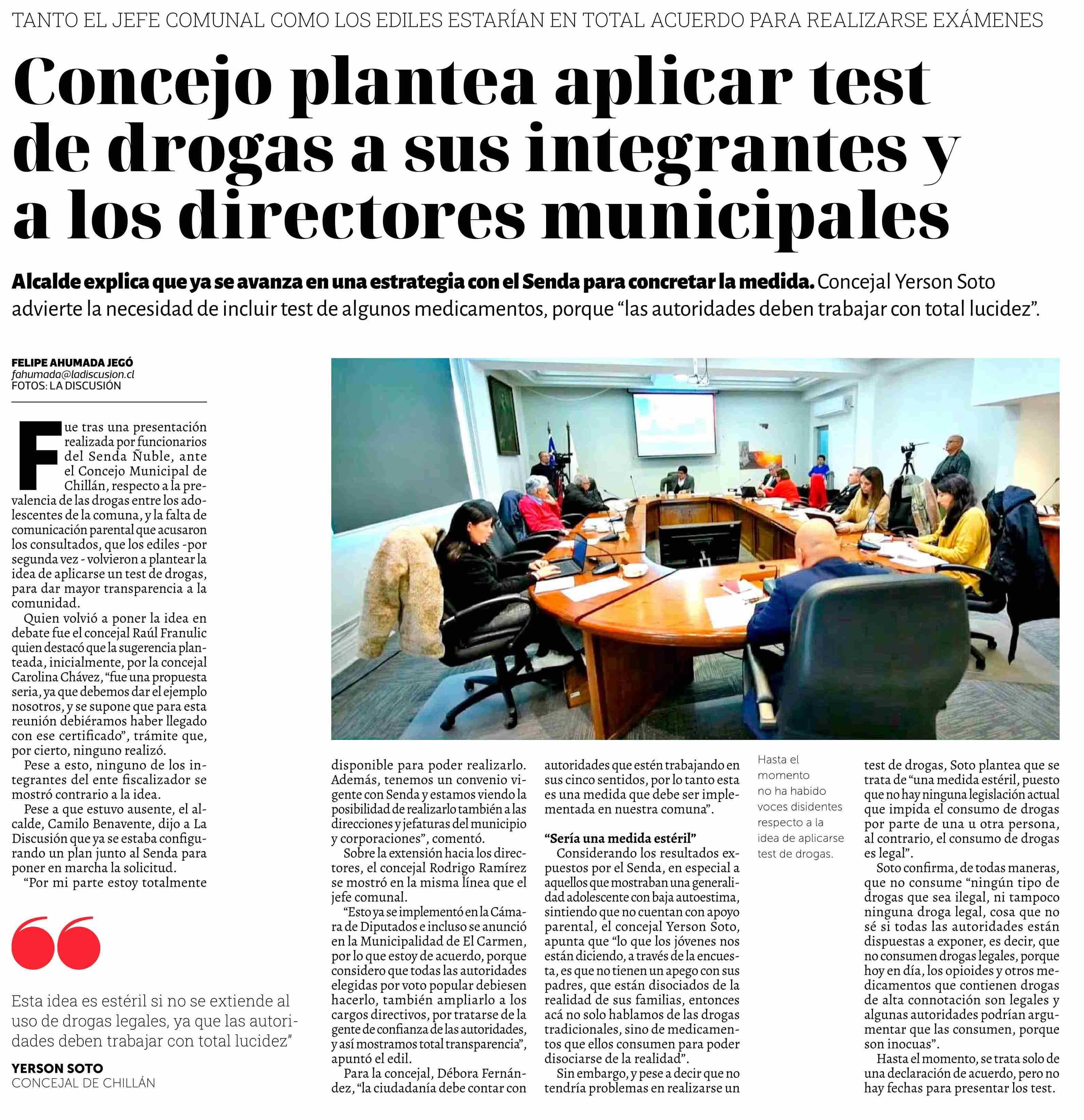 Concejo plantea aplicar test de drogas a sus integrantes y a los directores municipales 18-06-2025 La Discusión |