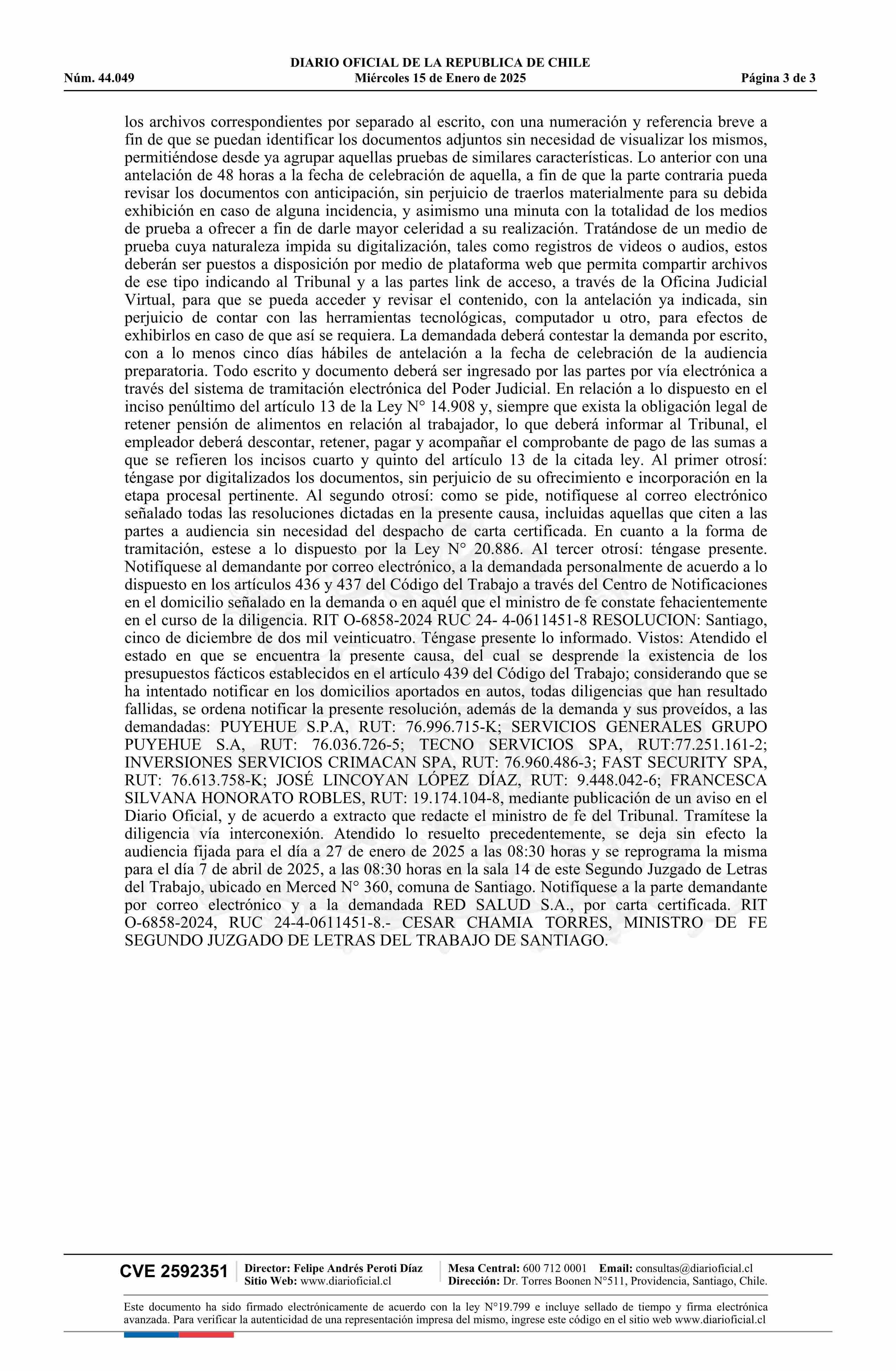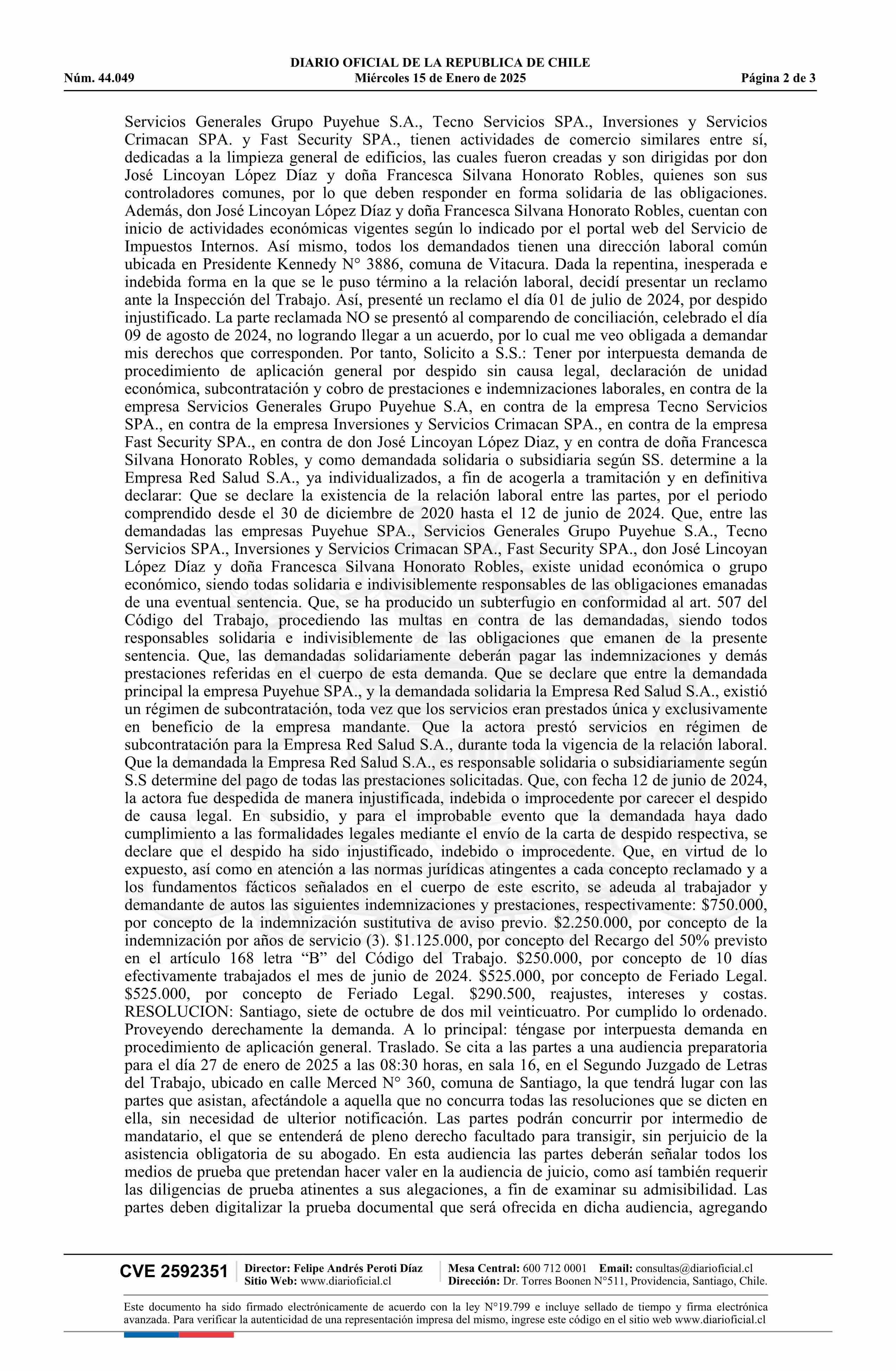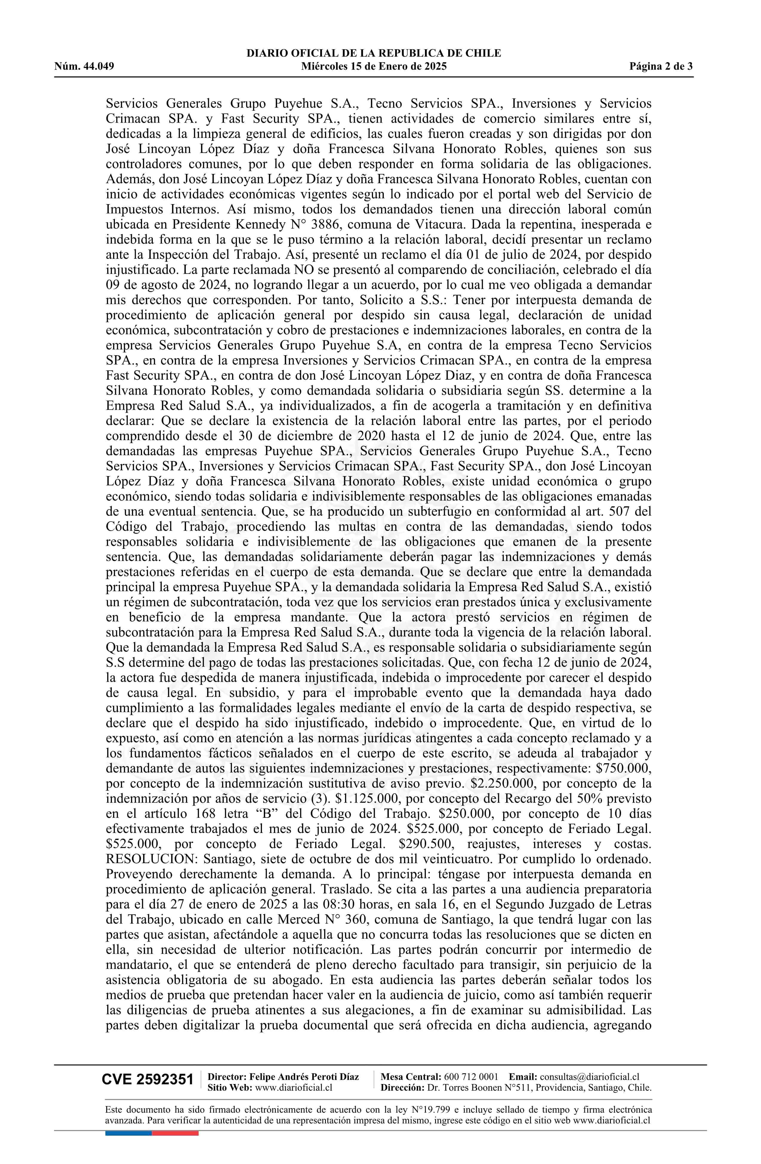 Lara Orellana Irma Pilar - Servicios Generales Grupo Puyehue S.A. 15-01-2025 Diario Oficial Edición Electrónica |