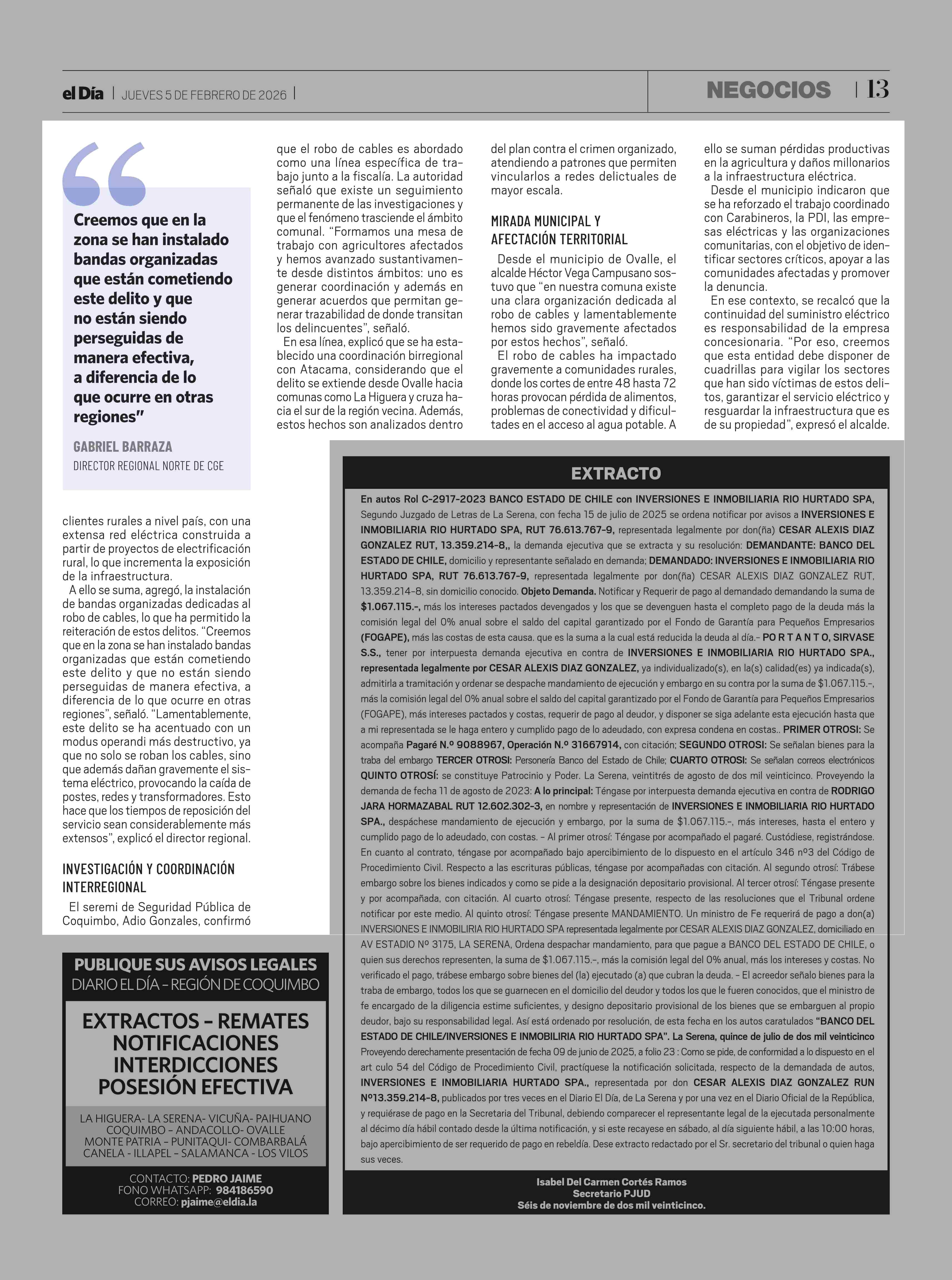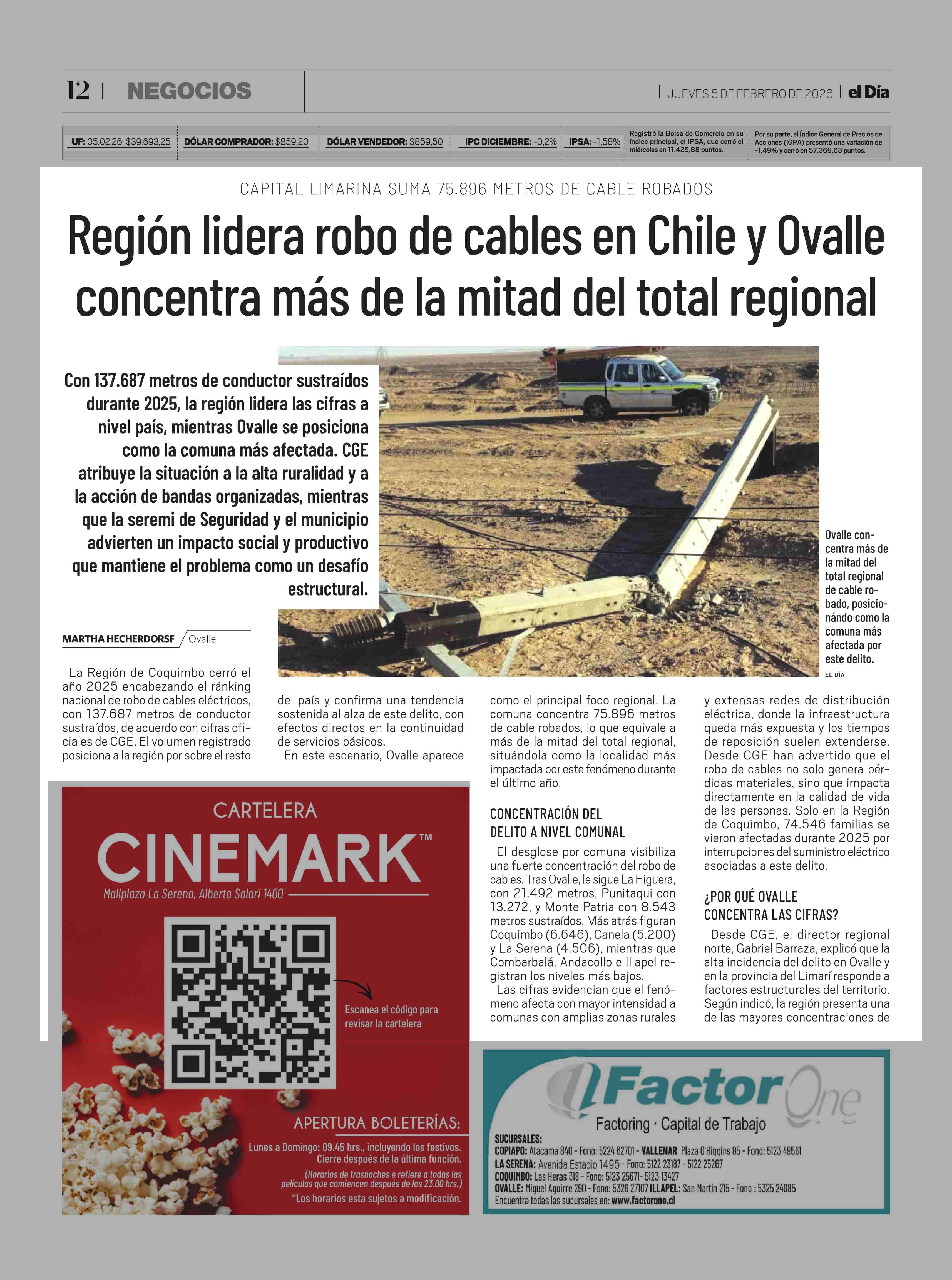 Región lidera robo de cables en Chile y Ovalle concentra más de la mitad del total regional 05-02-2026 El Día |