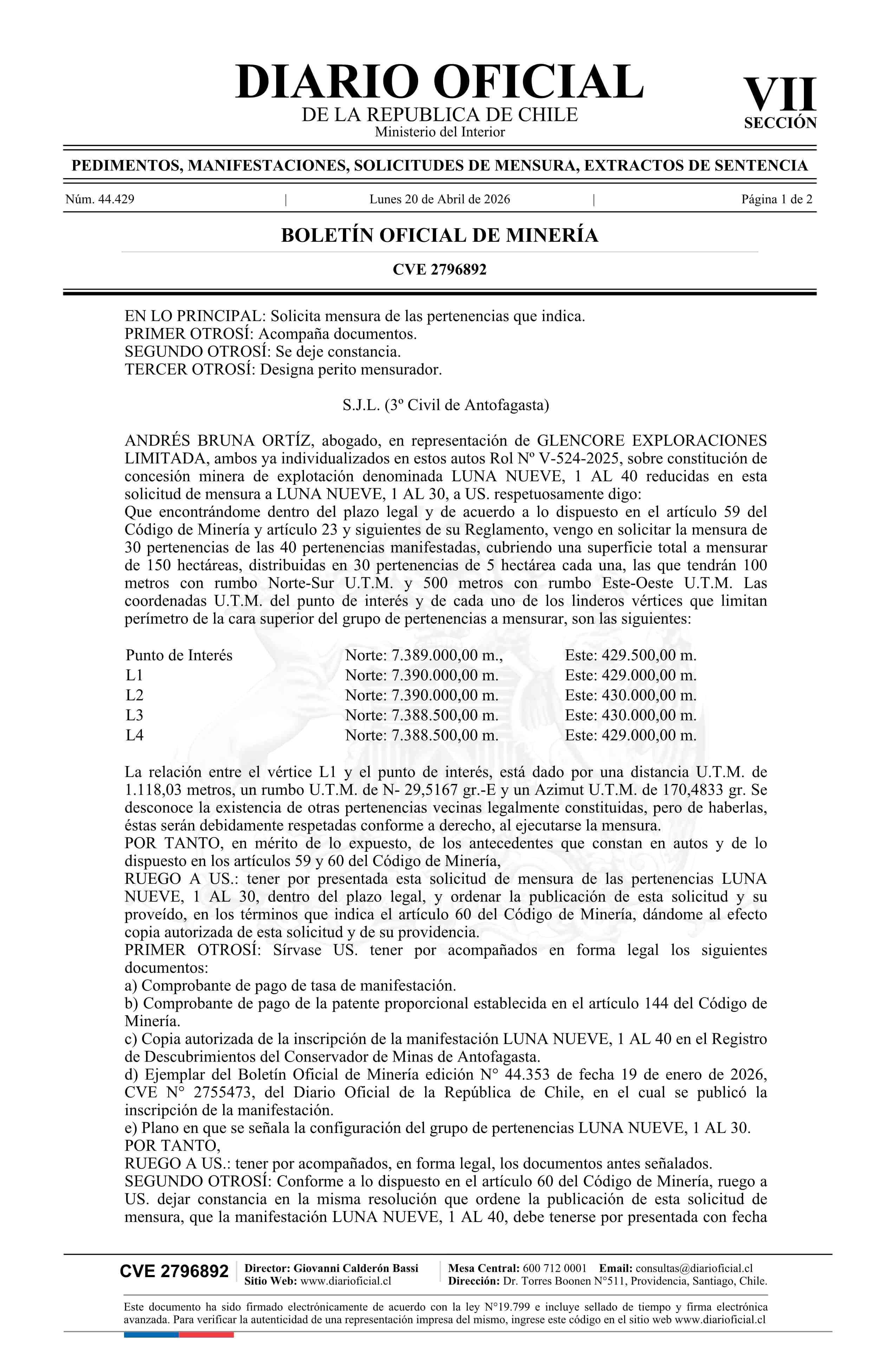 LUNA NUEVE, 1 AL 30 / Glencore Exploraciones Limitada 20-04-2026 DIARIO OFICIAL CHILE - BOLETÍN OFICIAL DE MINERÍA |