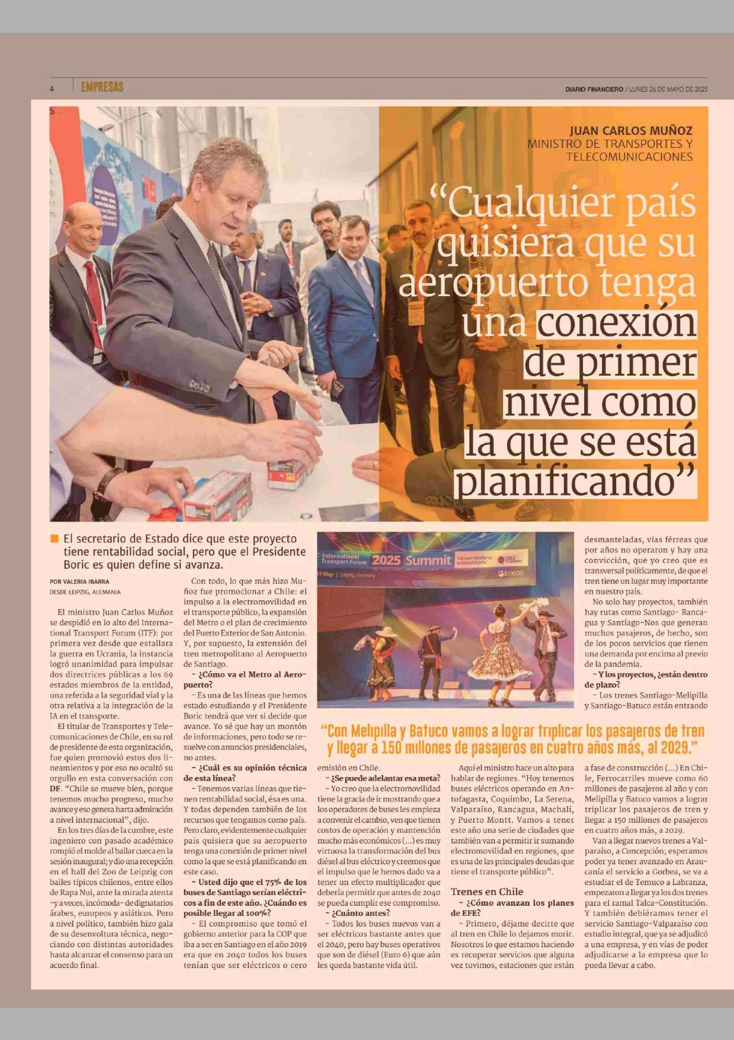 " Cualquier país quiaiera que su aeropuerto tenga una de primer nivel como la que se esta planificando” 26-05-2025 Diario Financiero |