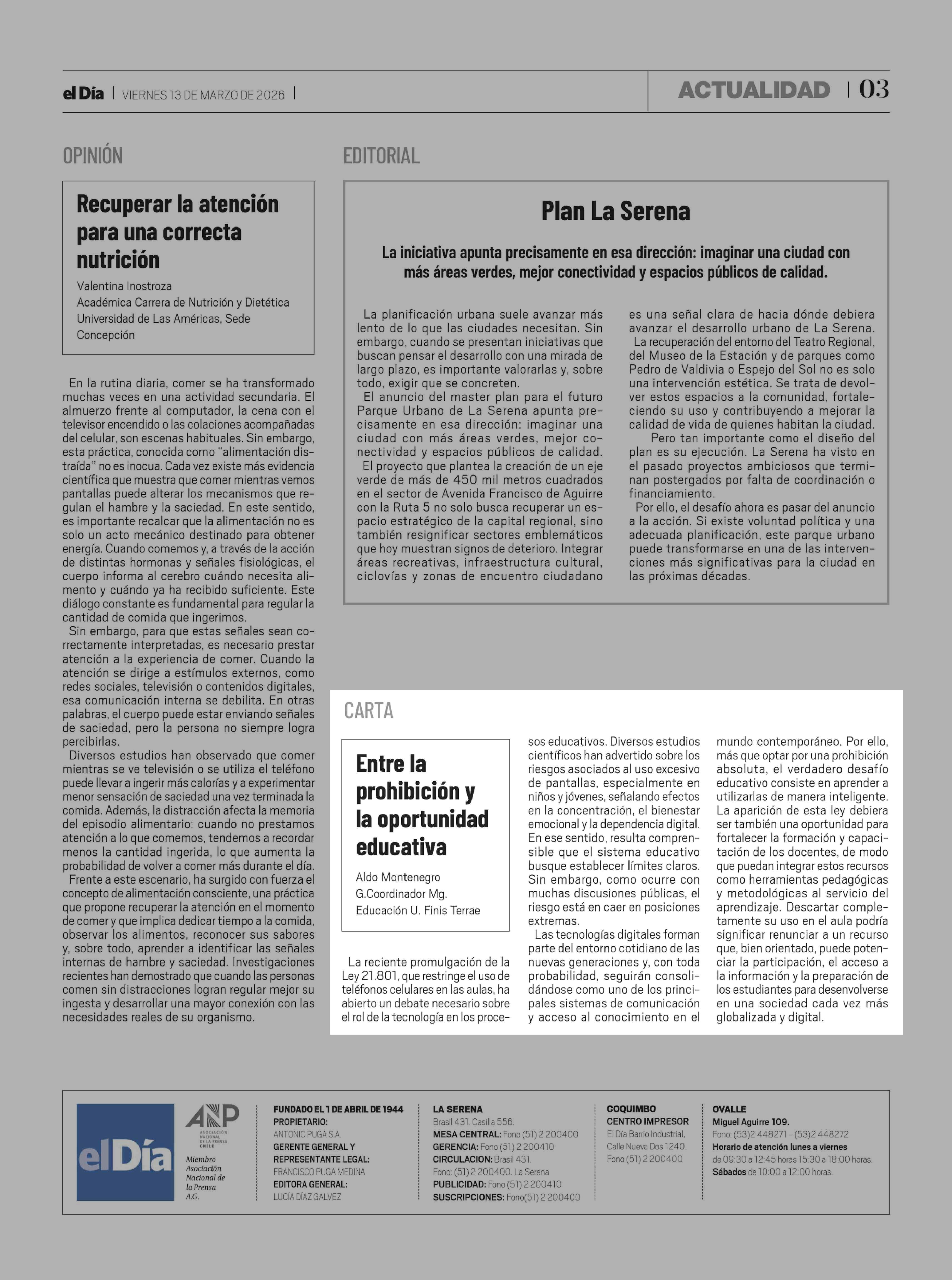 Columnas de Opinión: Entre la prohibición y la oportunidad educativa Aldo Montenegro G.Coordinador Mg. Educación U. Finis Terrae 13-03-2026 El Día |