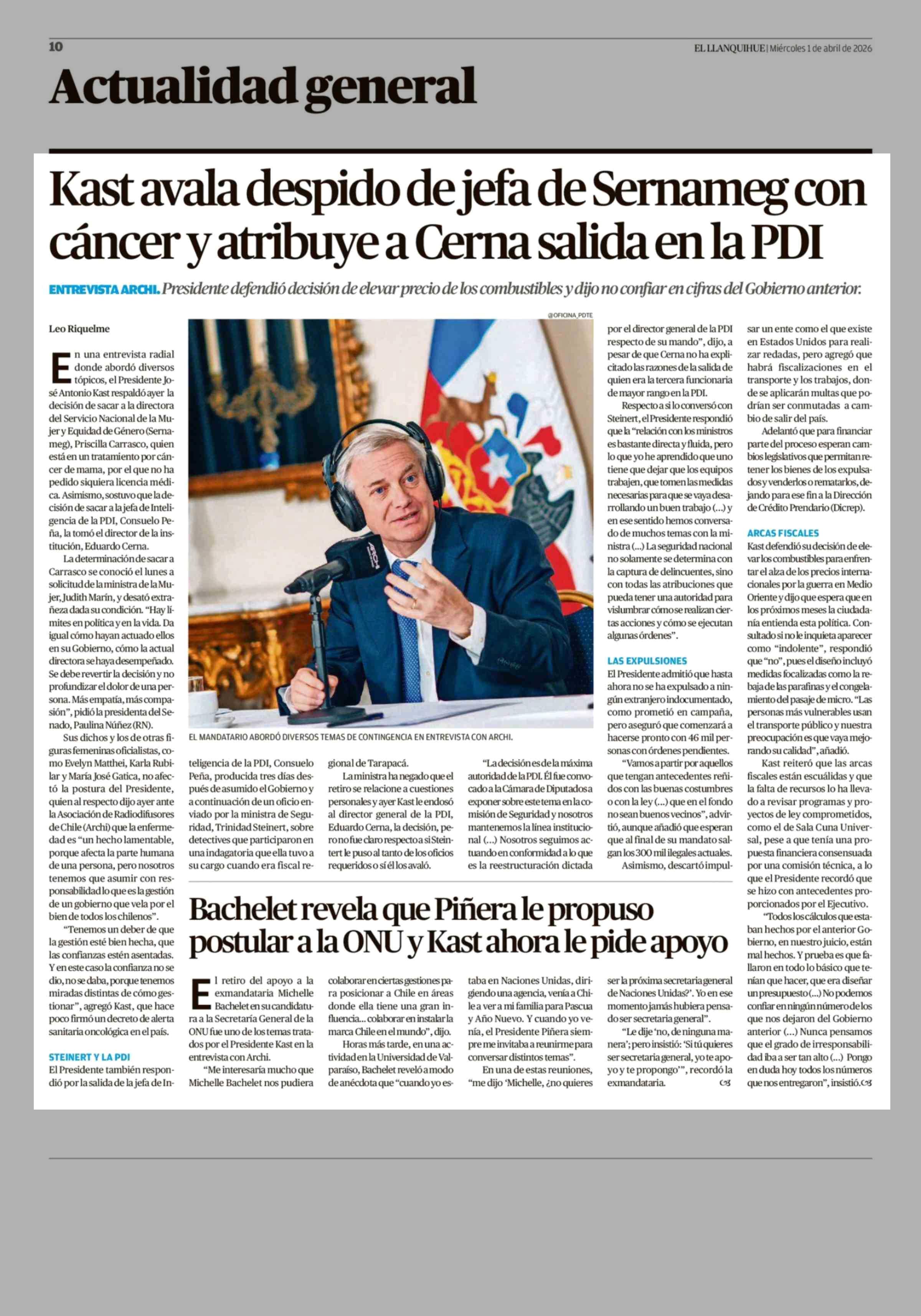 Título: Kast avala despido de jefa de Sernameg con cáncer y atribuye a Cerna salida en la PDI