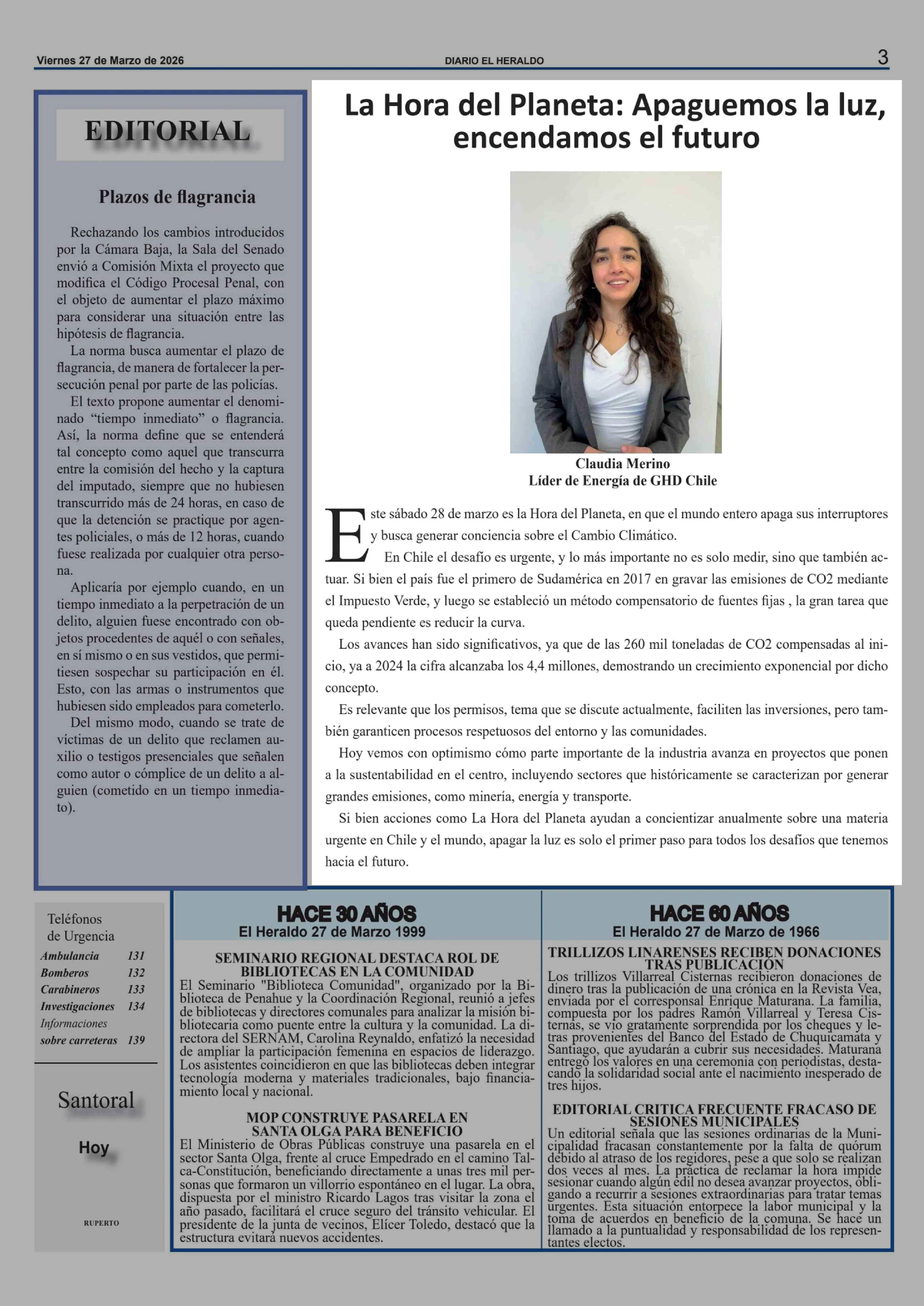 Columnas de Opinión: La Hora del Planeta: Apaguemos la luz, encendamos el futuro 27-03-2026 El Heraldo |