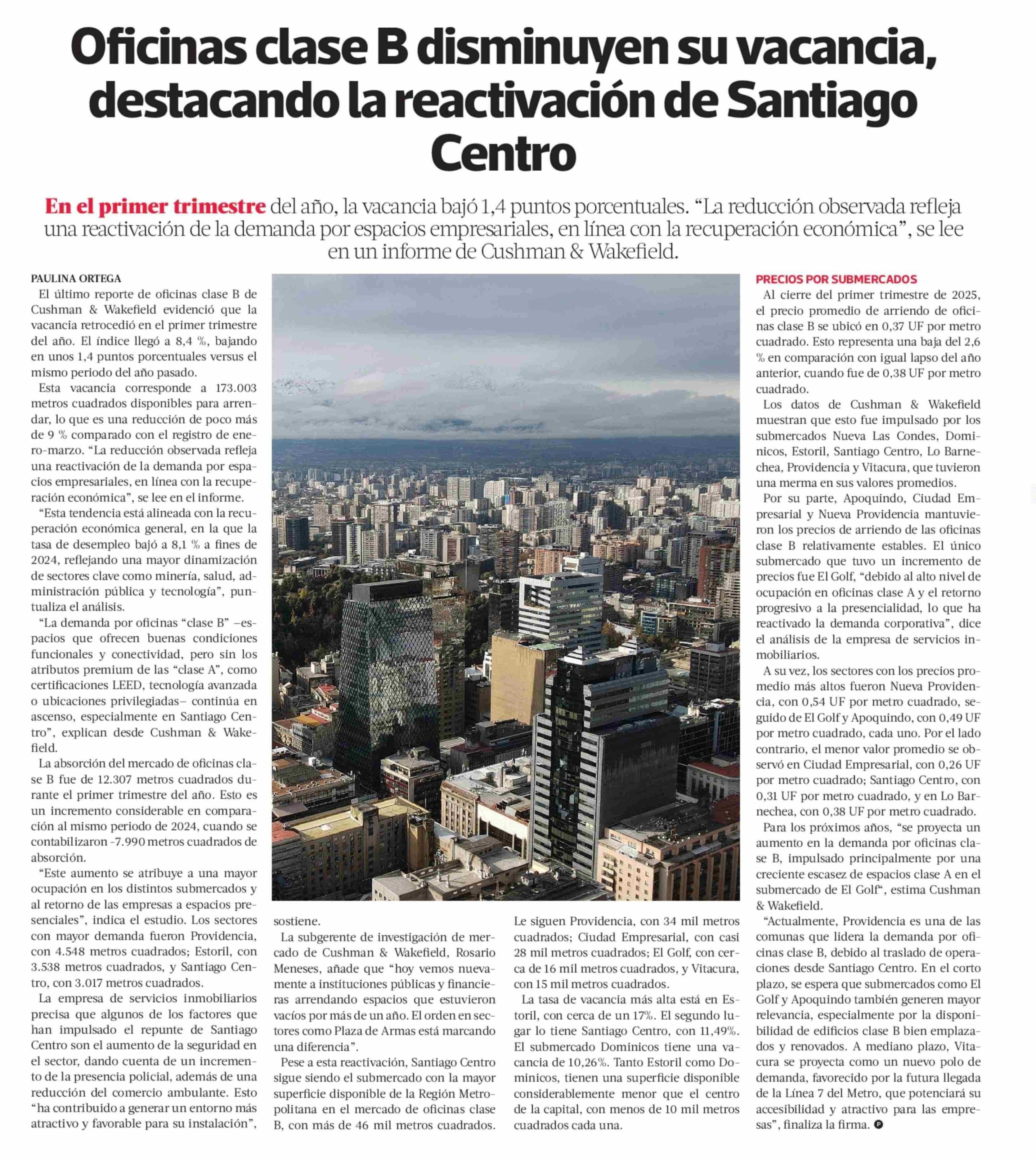 | Título: | Oficinas clase B disminuyen su vacancia, destacando la reactivación de Santiago Centro |