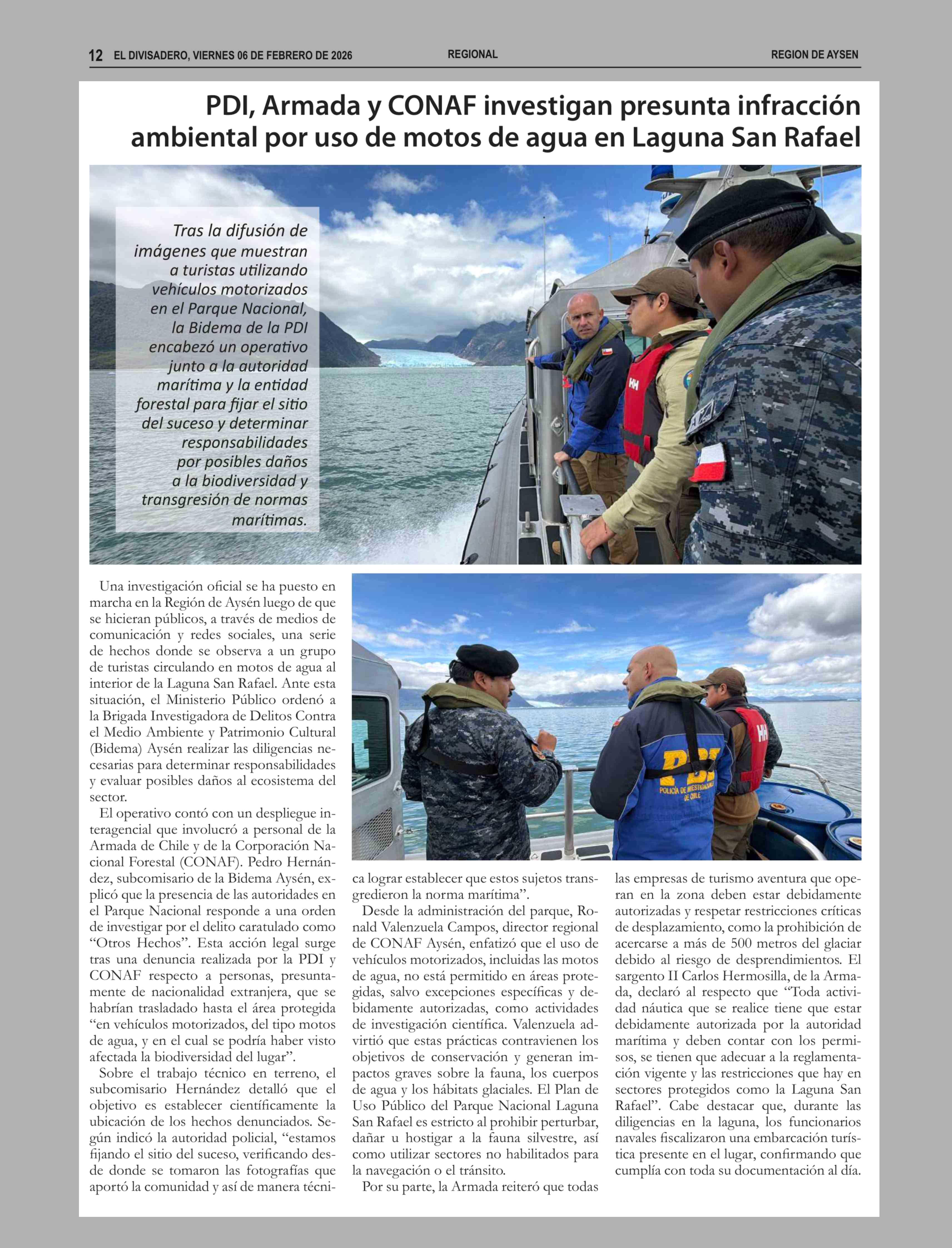 Título: PDI, Armada y CONAF investigan presunta infracción ambiental por uso de motos de agua en Laguna San Rafael