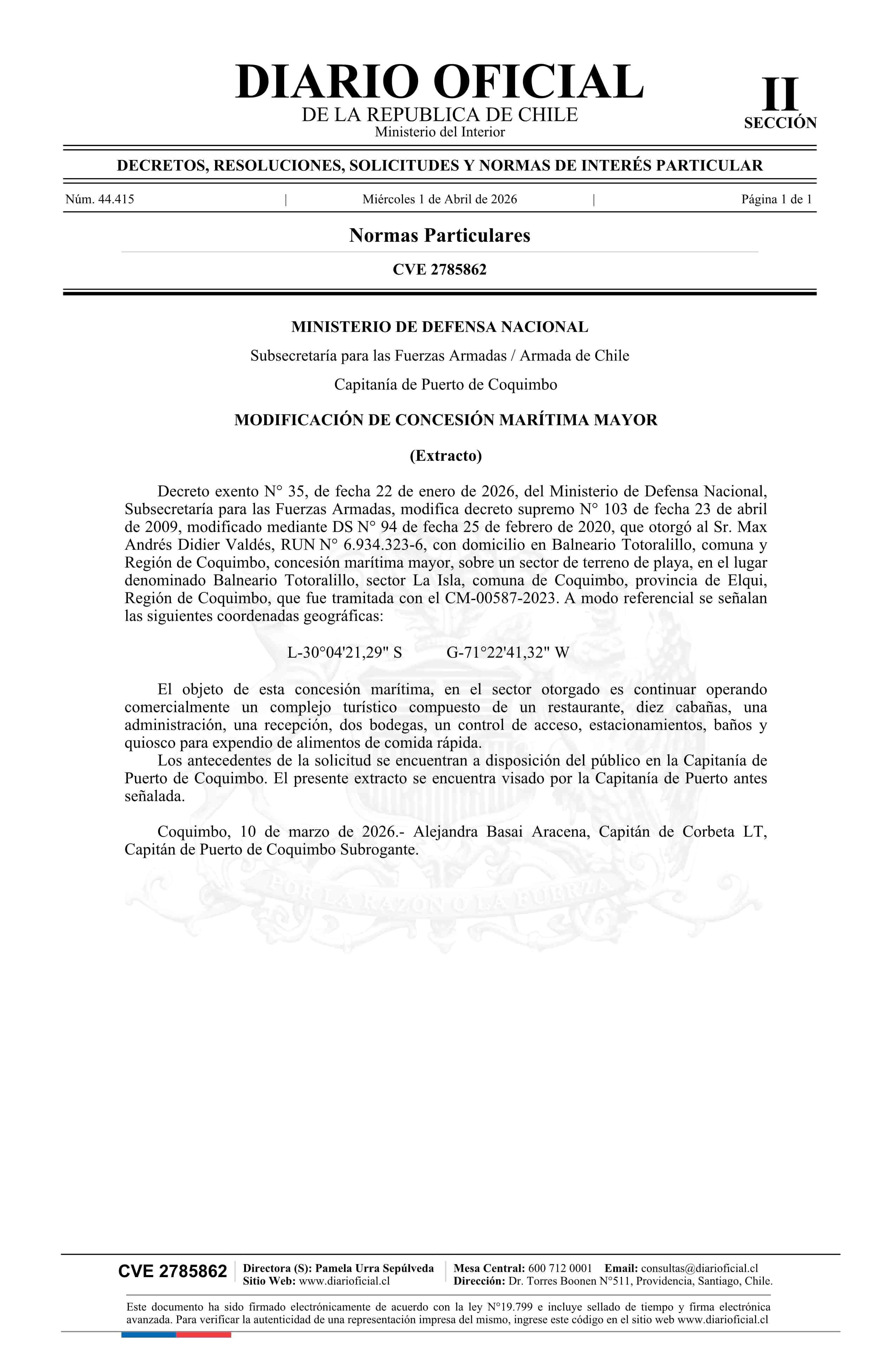 Título: Extracto de decreto exento número 35, de 2026.- Modificación de concesión marítima mayor