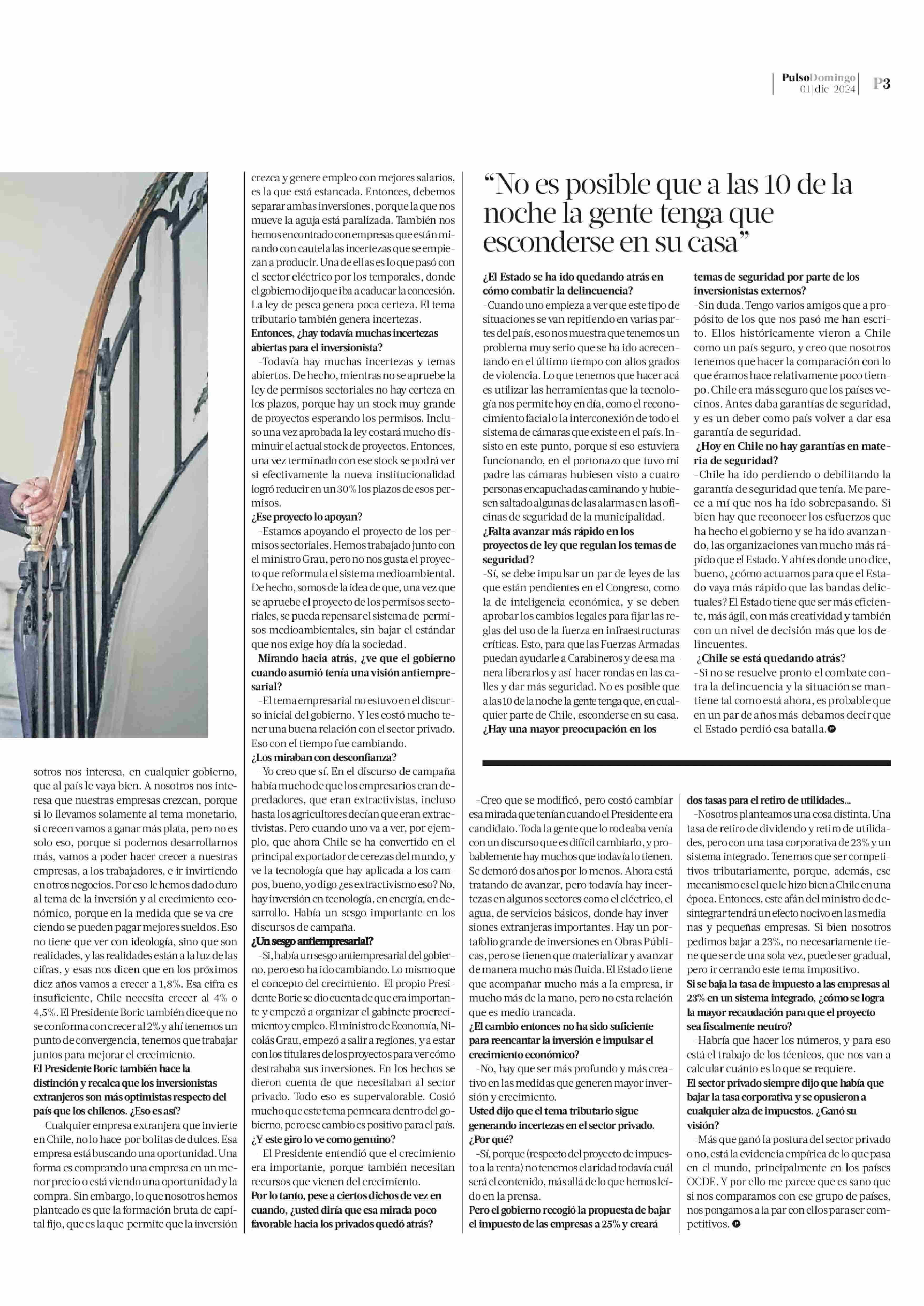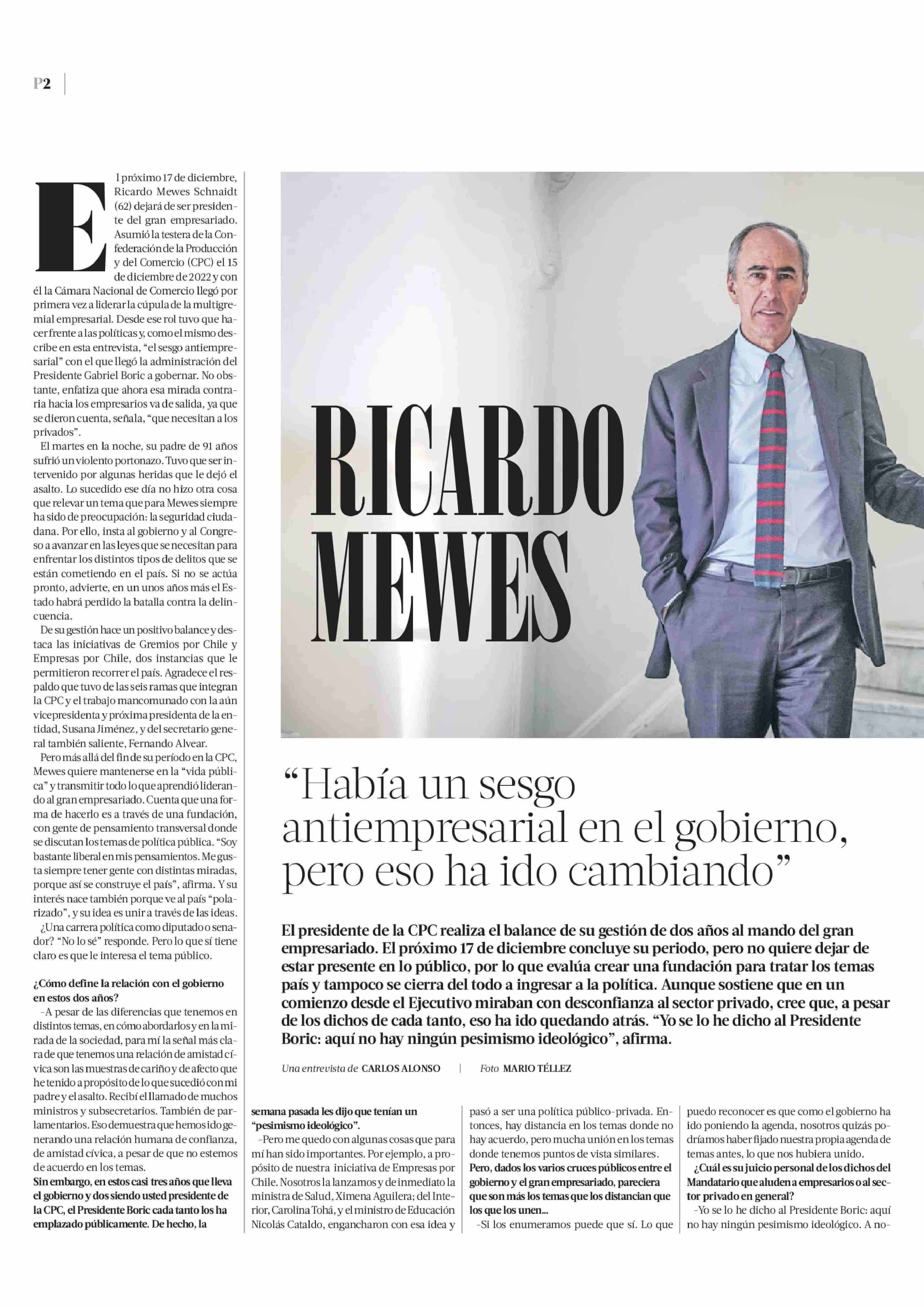 RICARDO MEWES “Había un sesgo antiempresarial en el gobierno, pero eso ha ido cambiando” 01-12-2024 La Tercera |