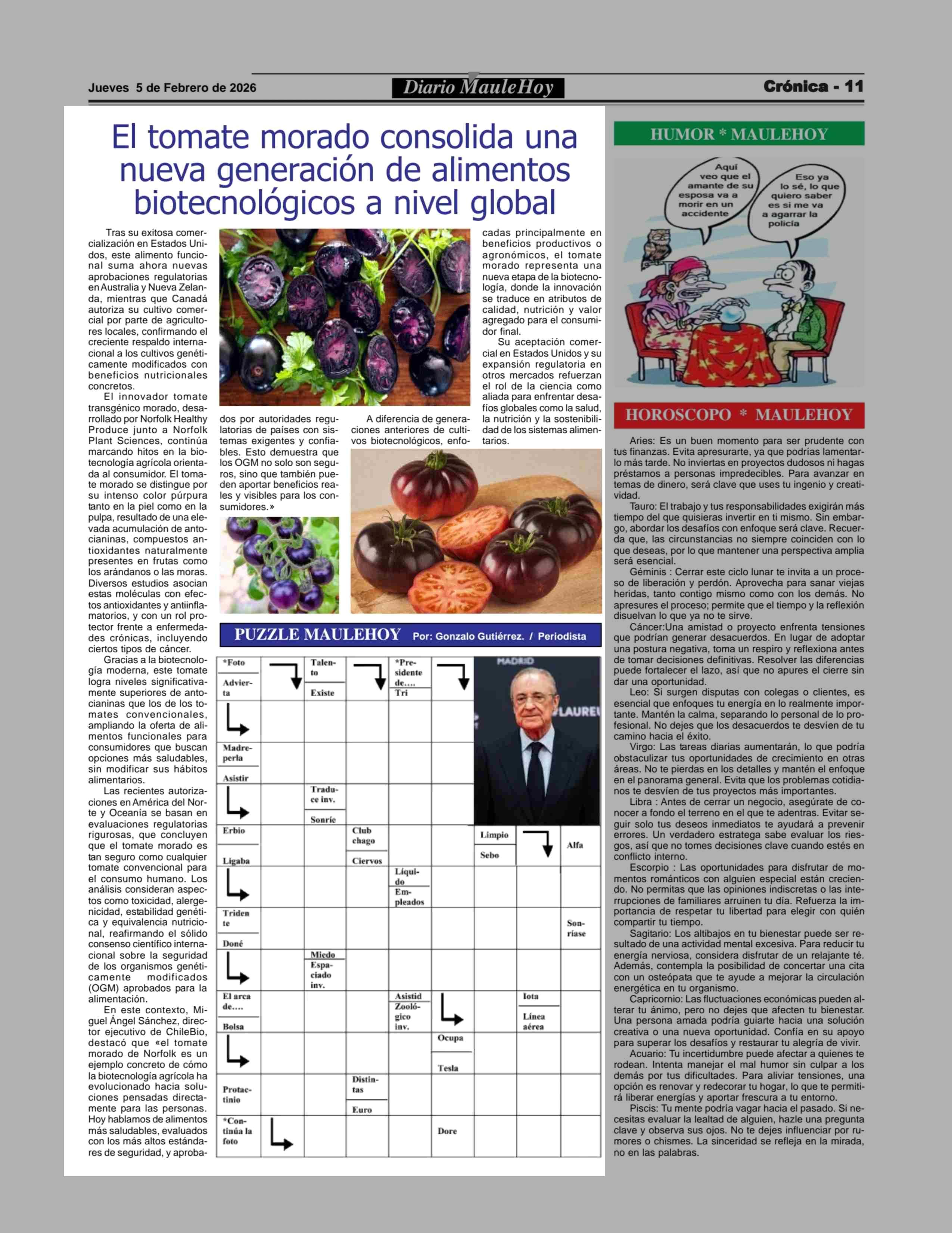 El tomate morado consolida una nueva generación de alimentos biotecnológicos a nivel global 05-02-2026 Maule Hoy |