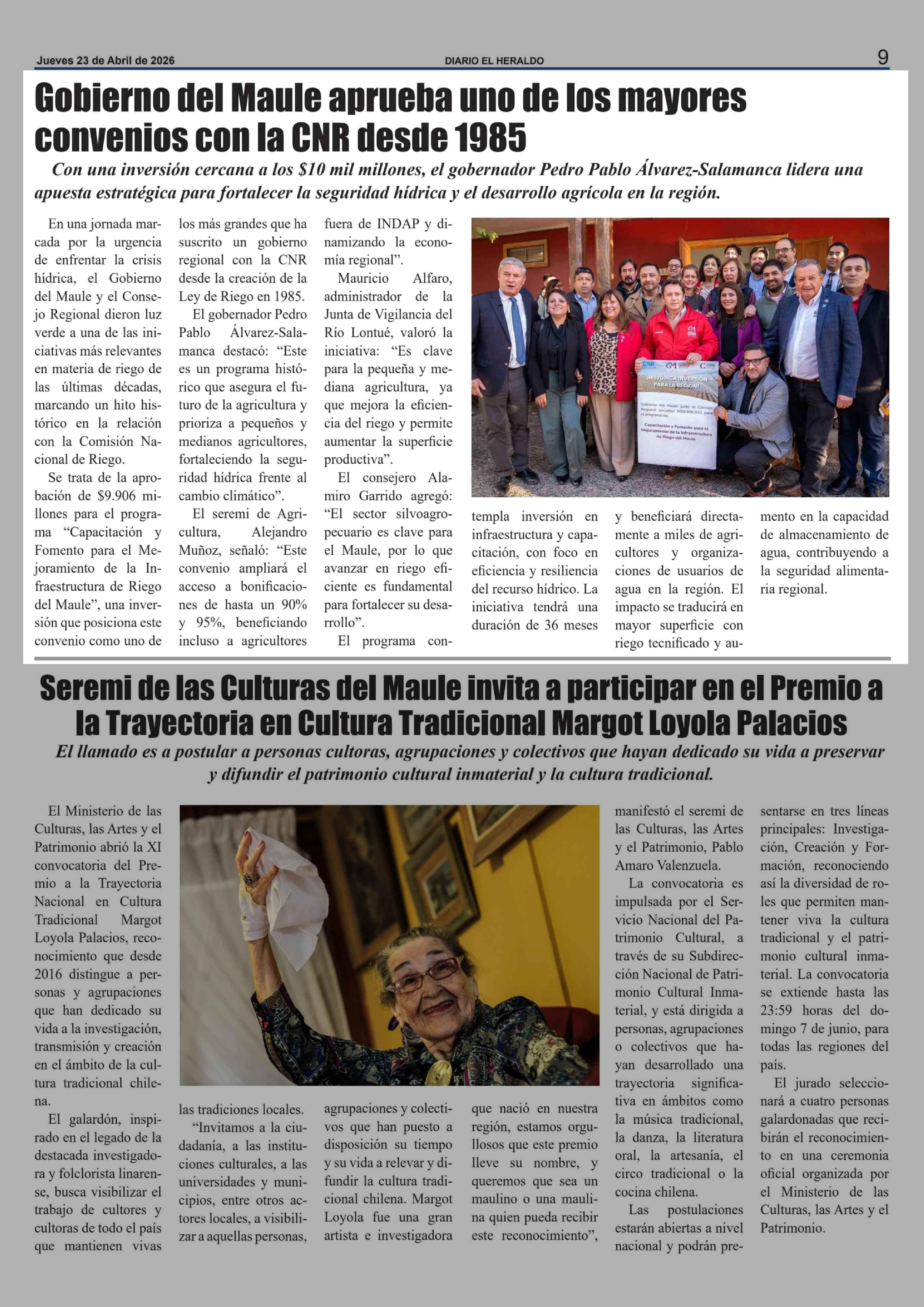 Gobierno del Maule aprueba uno de los mayores convenios con la CNR desde 1985 23-04-2026 El Heraldo |