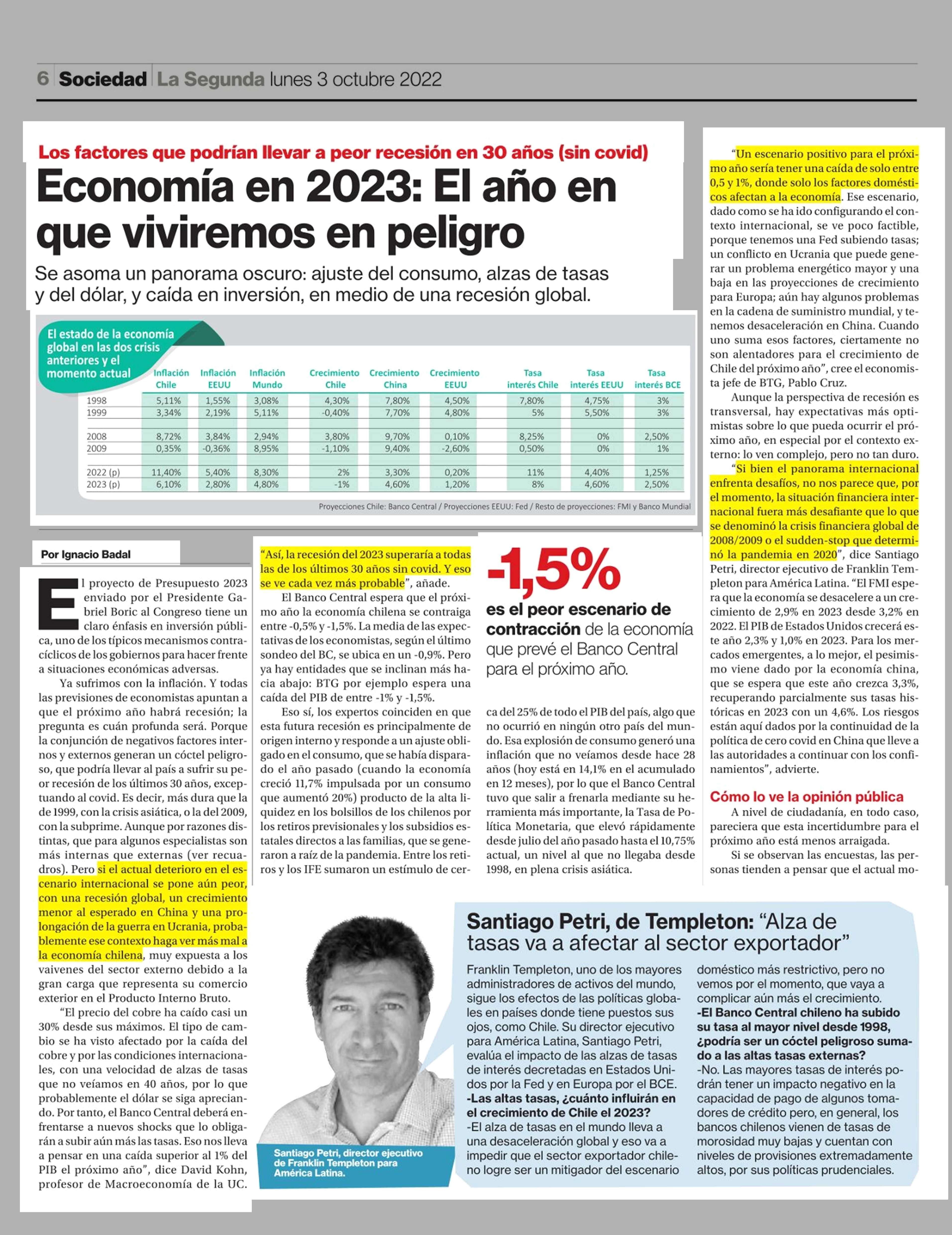 Economía en 2023: El año en que viviremos en peligro 03-10-2022 La Segunda |