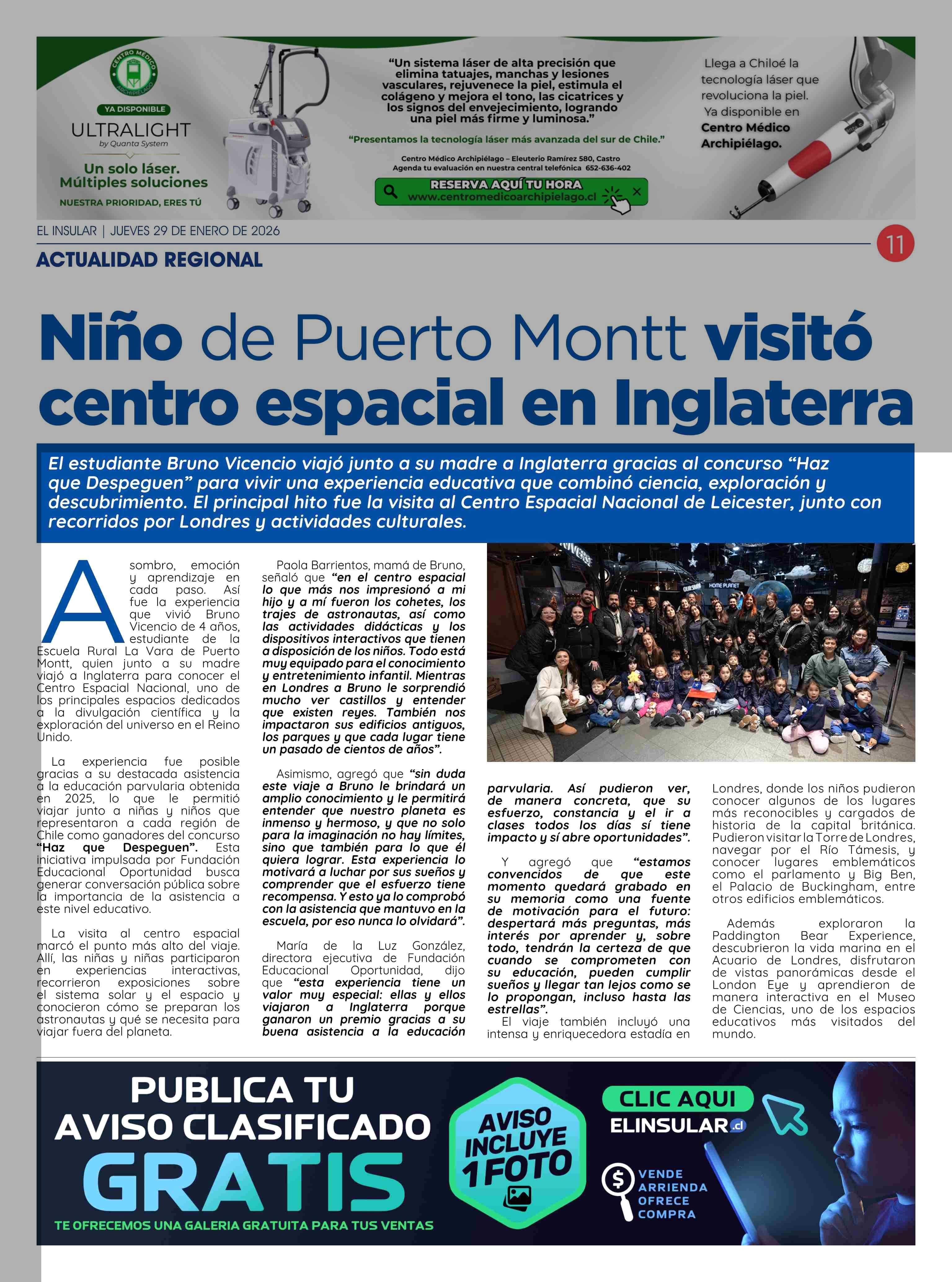 Niño de Puerto Montt visitó centro espacial en Inglaterra 29-01-2026 El Insular |