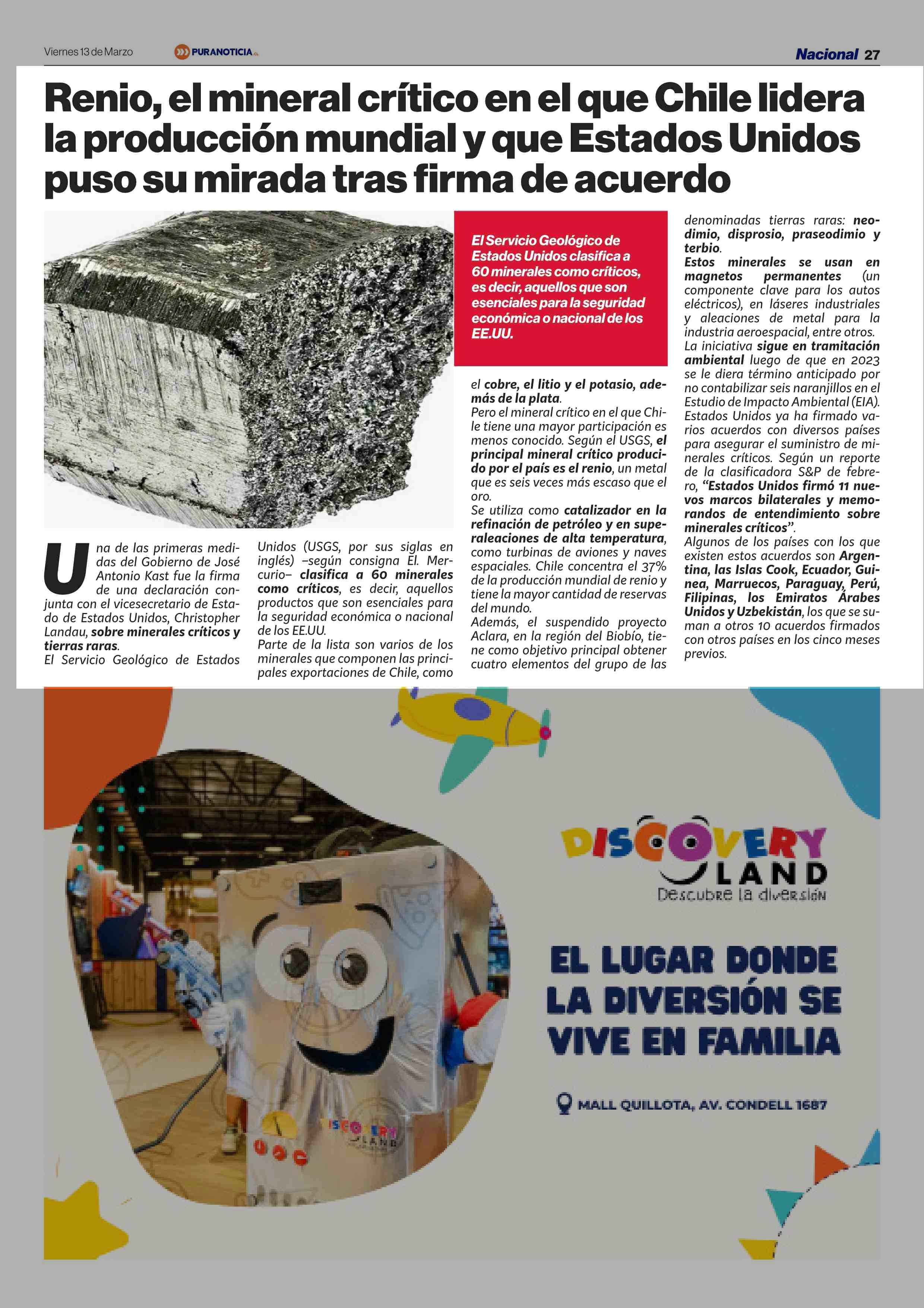 Título: Renio, el mineral crítico en el que Chile lidera la producción mundial y que Estados Unidos puso su mirada tras firma de acuerdo