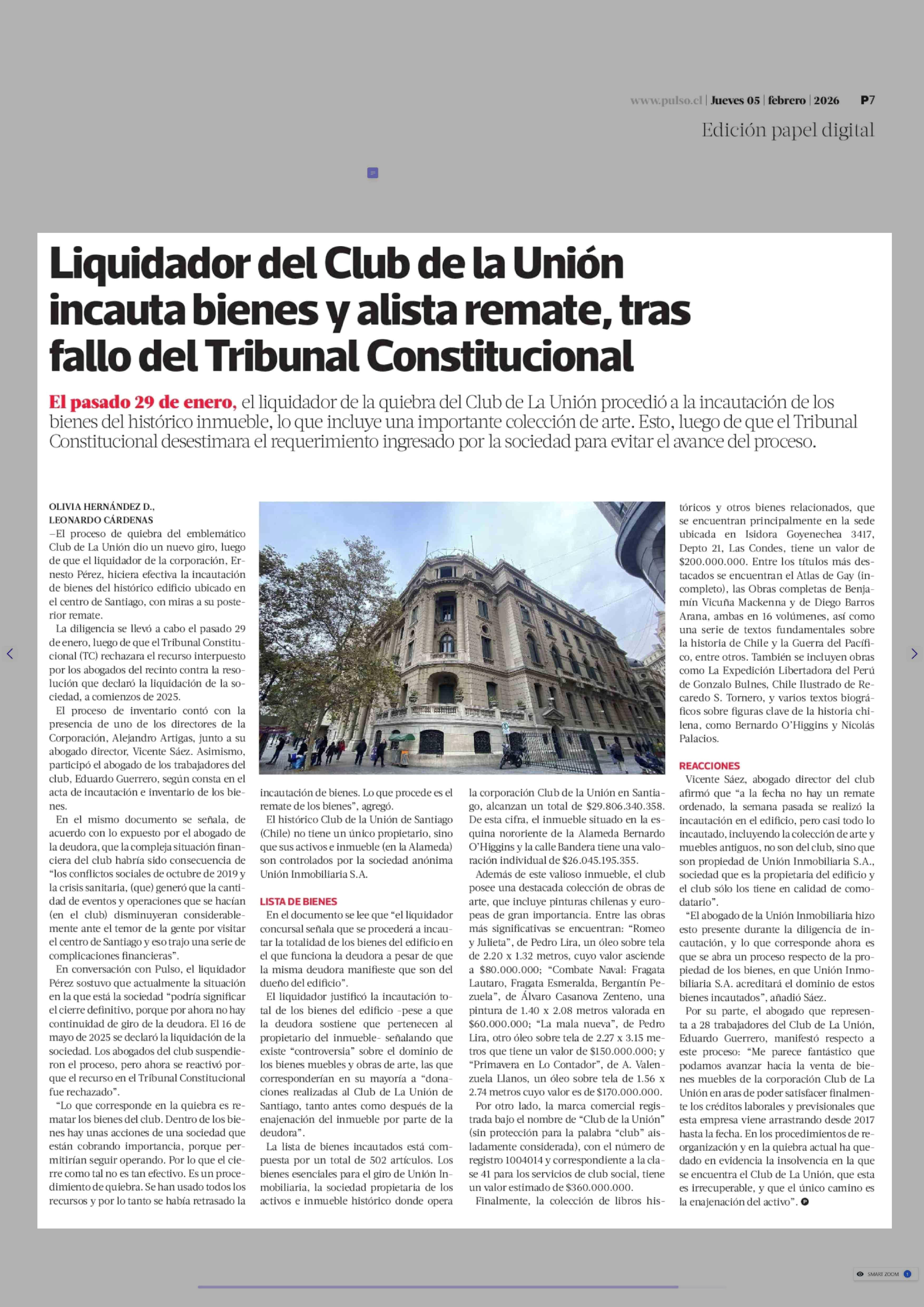 Liquidador del Club de la Unión incauta bienes y alista remate, tras fallo del Tribunal Constitucional 05-02-2026 La Tercera |