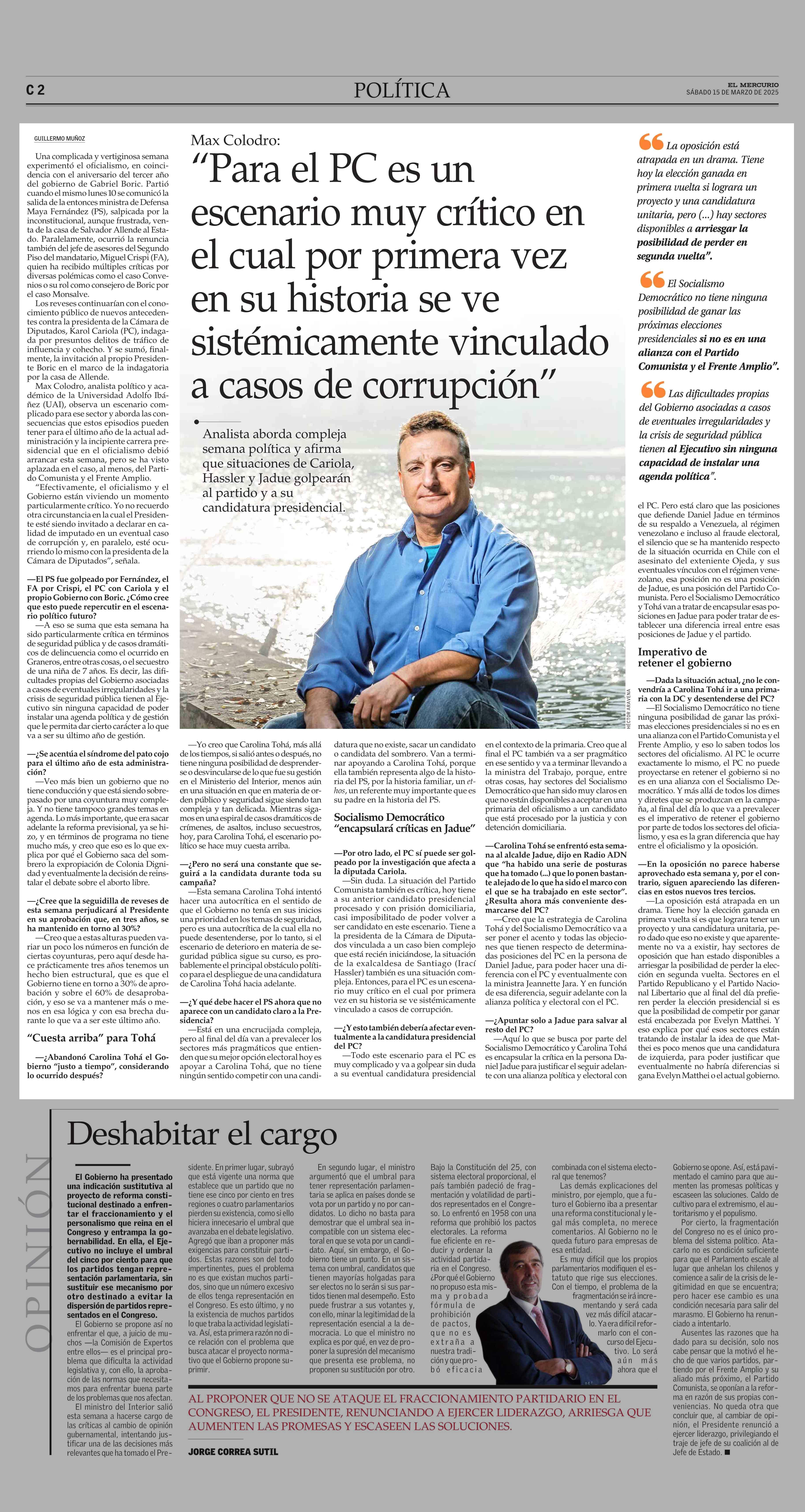 Título: “Para el PC es un escenario muy crítico en el cual por primera vez en su historia se ve sistémicamente vinculado a casos de corrupción”