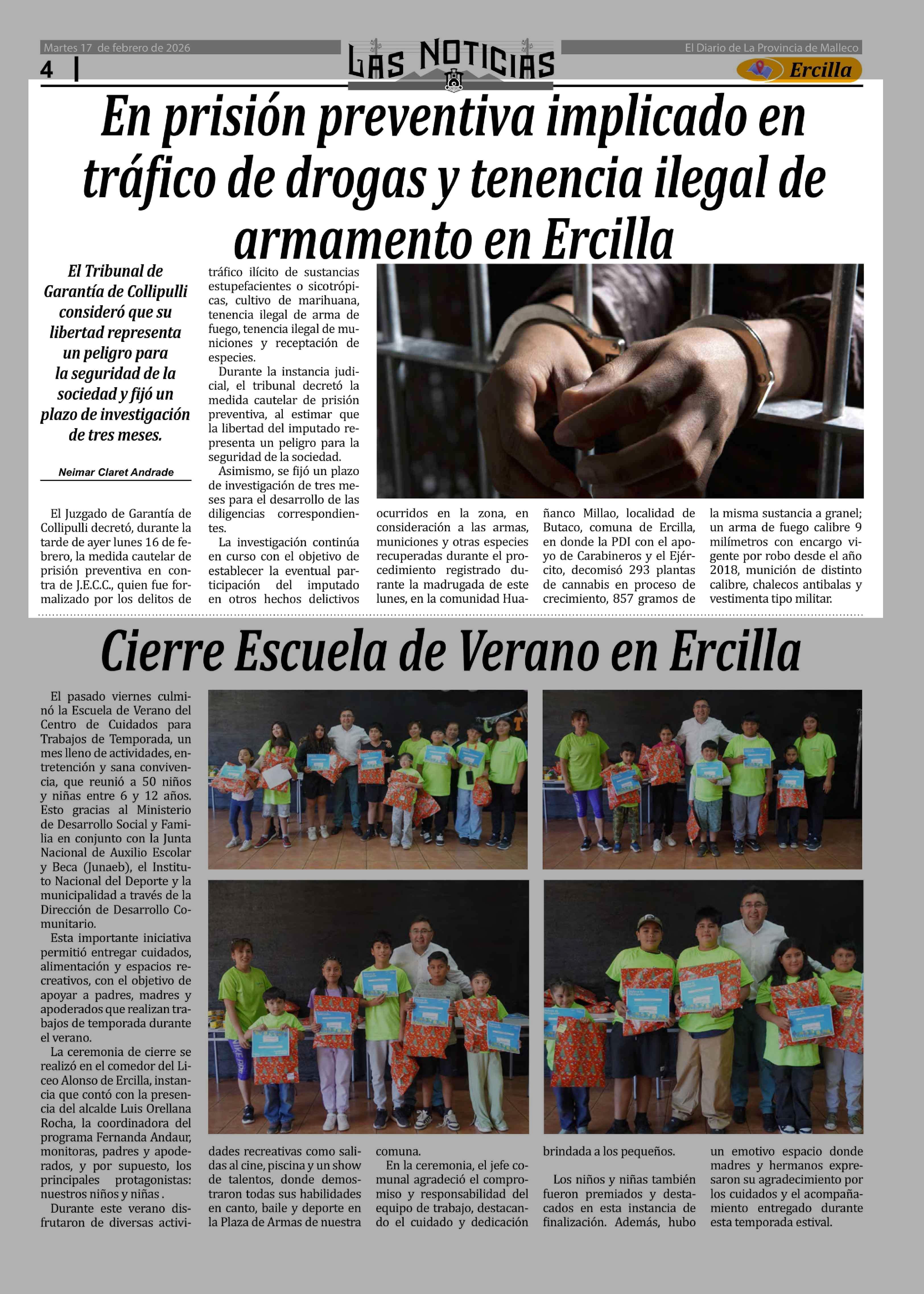 En prisión preventiva implicado en tráfico de drogas y tenencia ilegal de armamento en Ercilla 17-02-2026 Las Noticias |