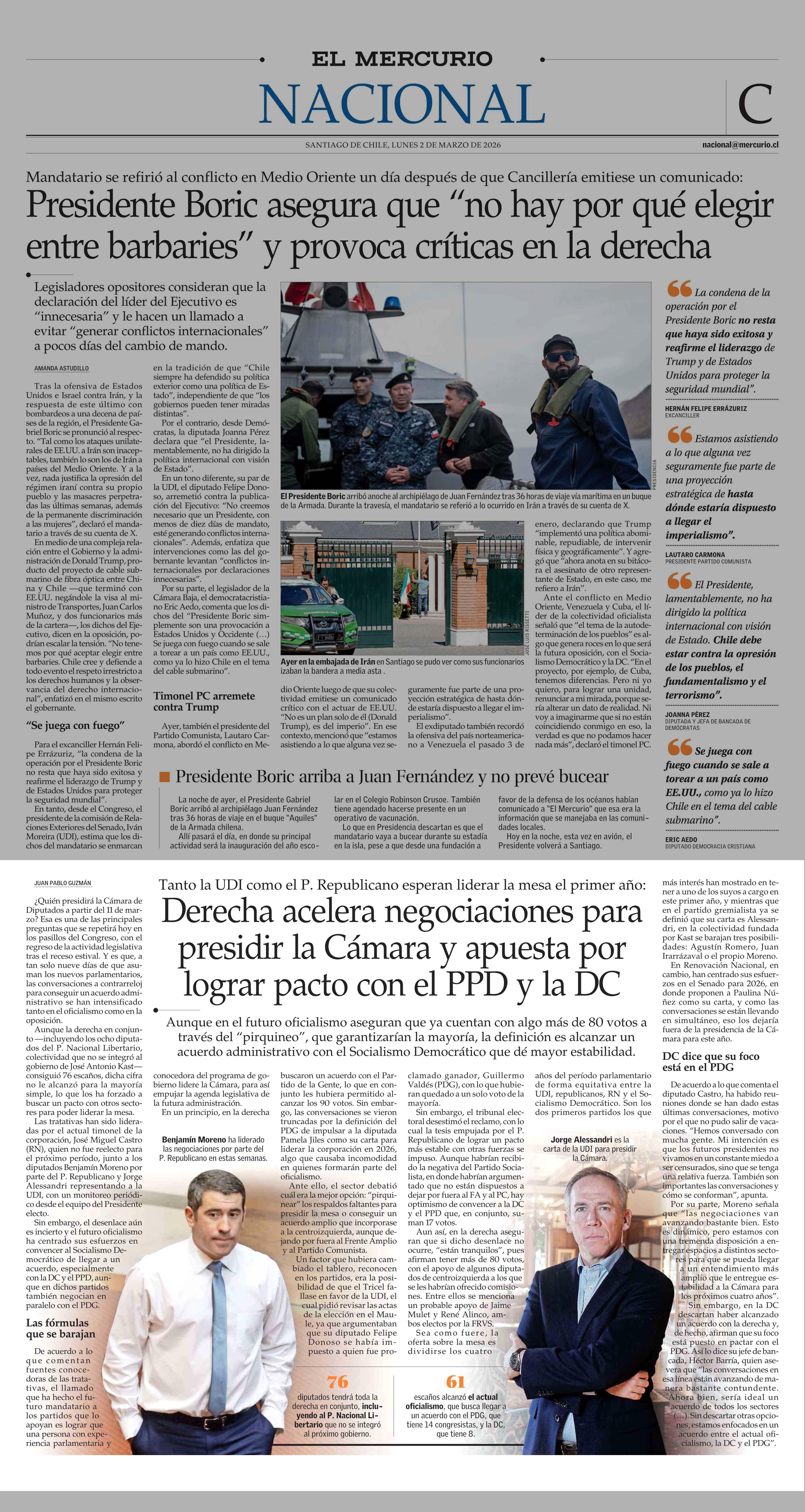Derecha acelera negociaciones para presidir la Cámara y apuesta por lograr pacto con el PPD y la DC 02-03-2026 El Mercurio |