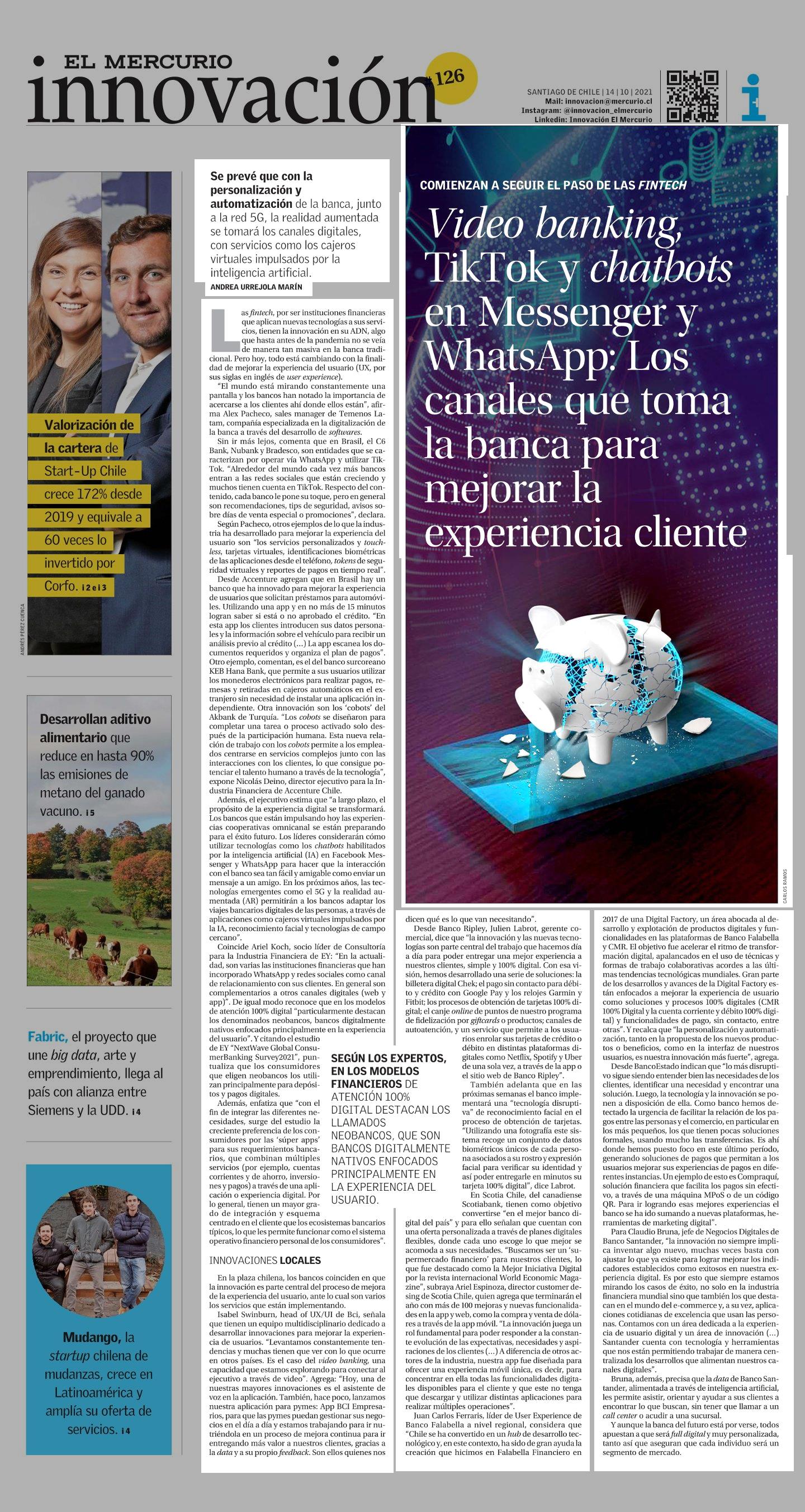 Video banking, TikTok y chatbots en Messenger y WhatsApp: Los. canales que toma la banca para mejorar la experiencia cliente 14-10-2021 El Mercurio |