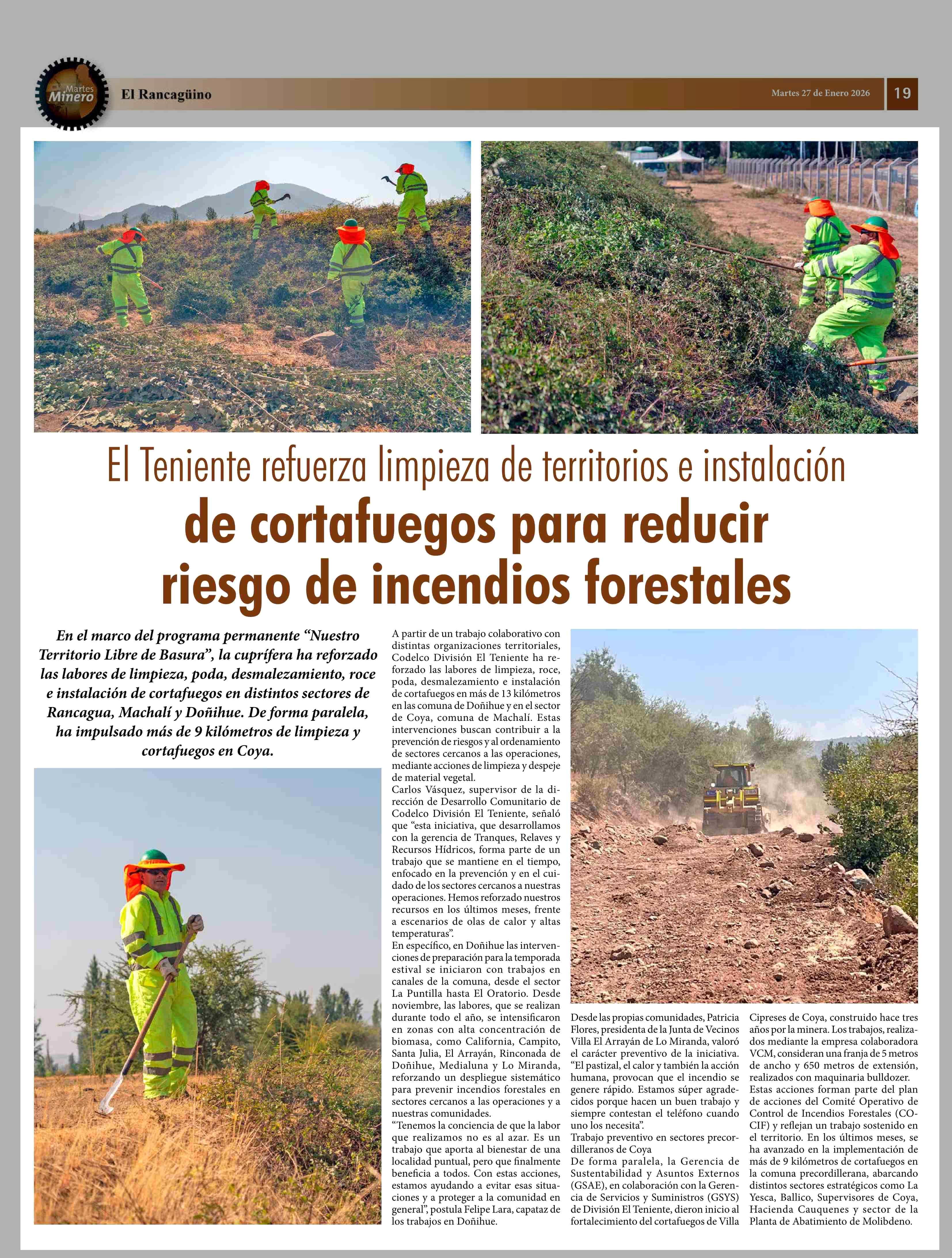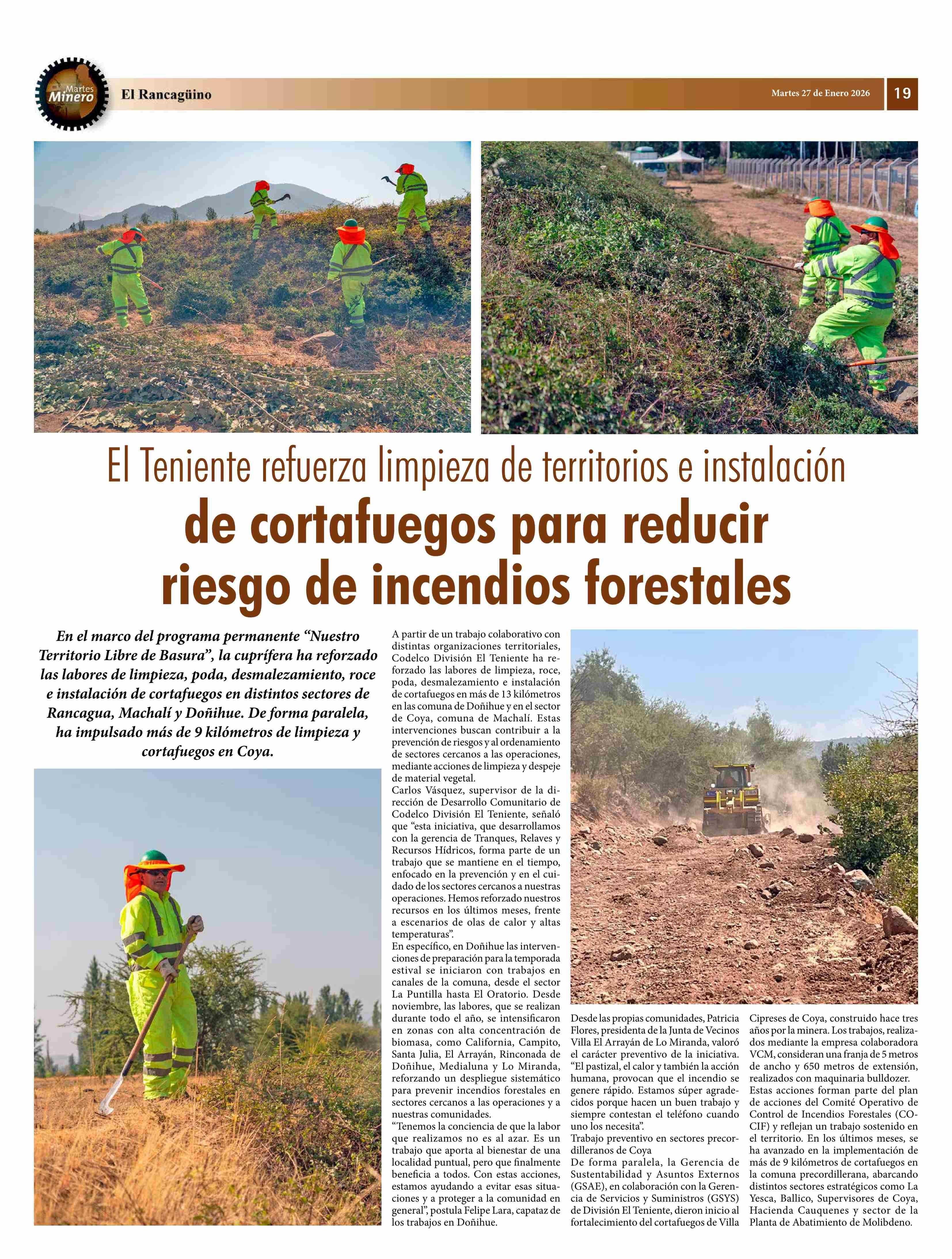 Título: El Teniente refuerza limpieza de territorios e instalación de cortafuegos para reducir riesgo de incendios forestales