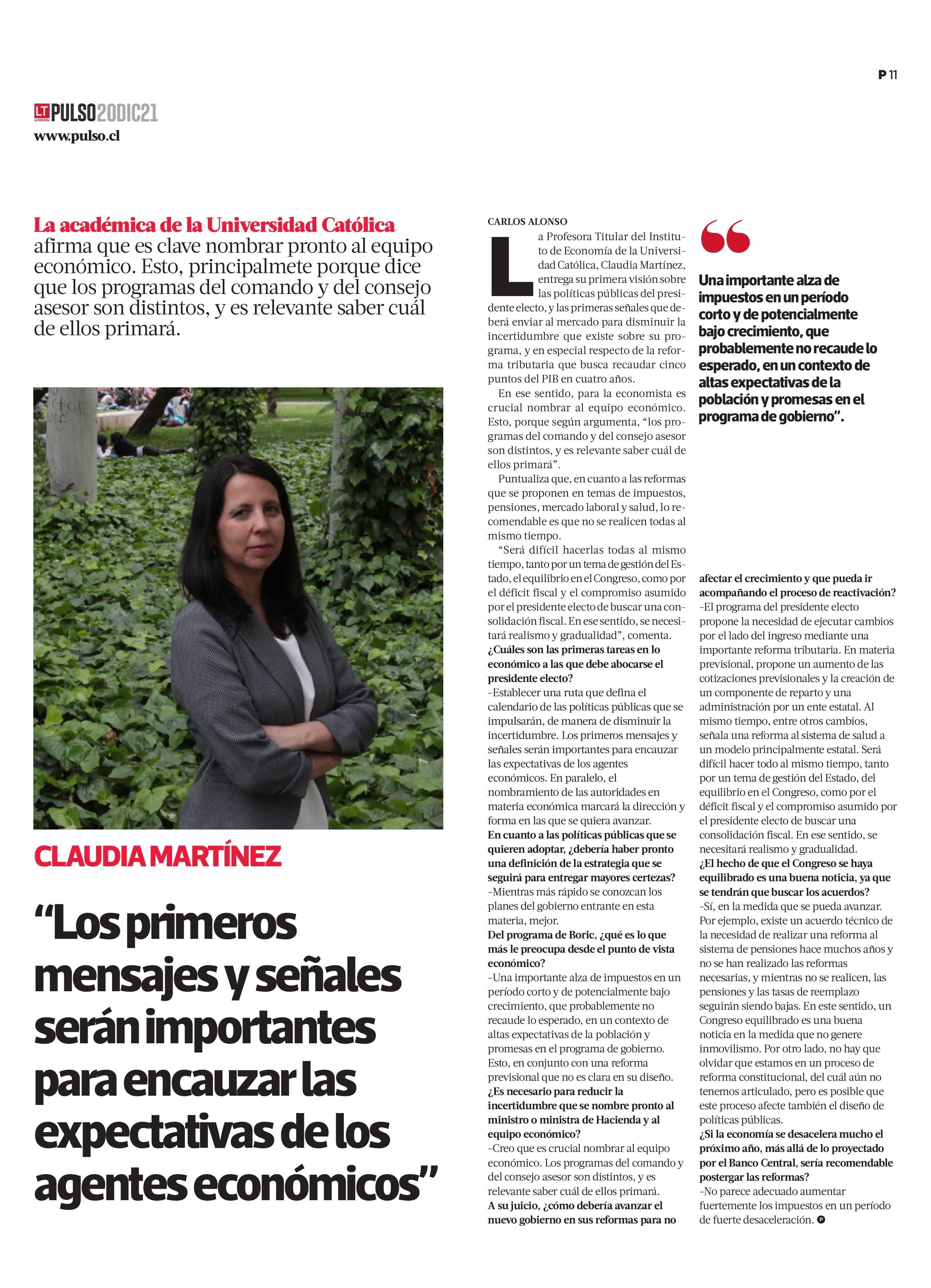 CLAUDIA MARTÍNEZ “Los primeros mensajes y señales serán importantes para encauzar las expectativas de los agentes económicos” 20-12-2021 La Tercera |