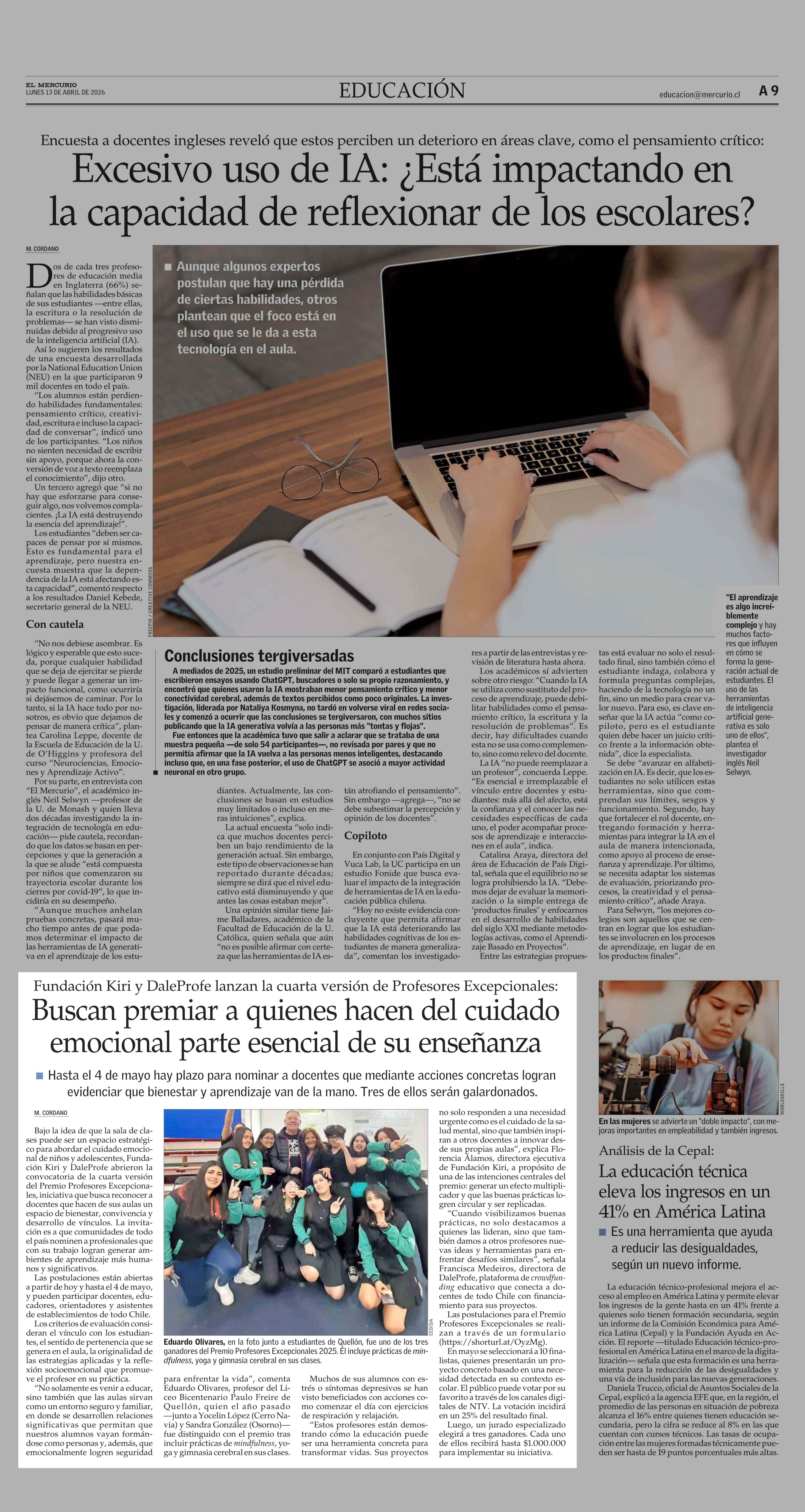 Buscan premiar a quienes hacen del cuidado emocional parte esencial de su enseñanza 13-04-2026 El Mercurio |