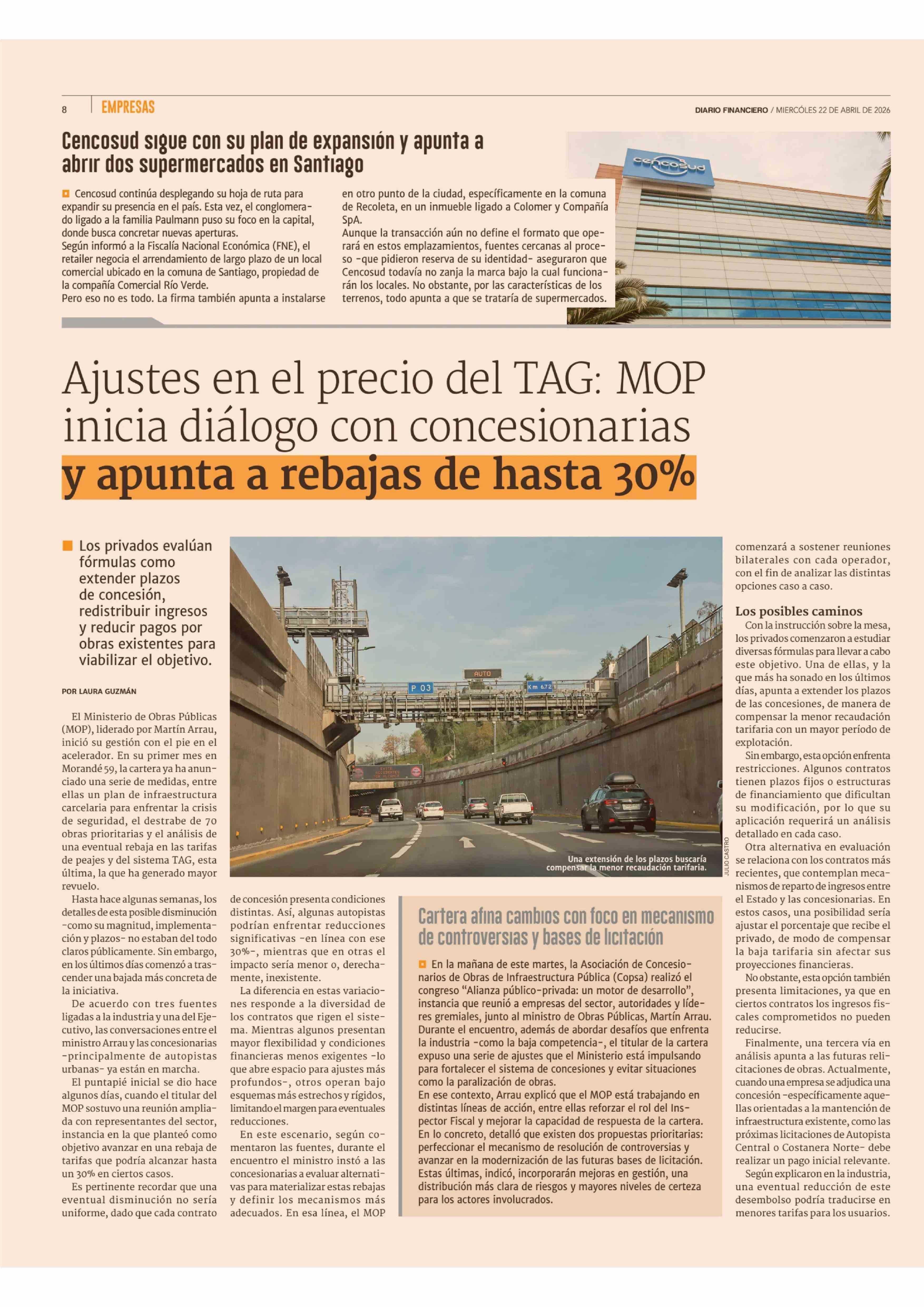 Cencosud sigue con su plan de expansión y apunta a abrir dos supermercados en Santiago 22-04-2026 Diario Financiero |